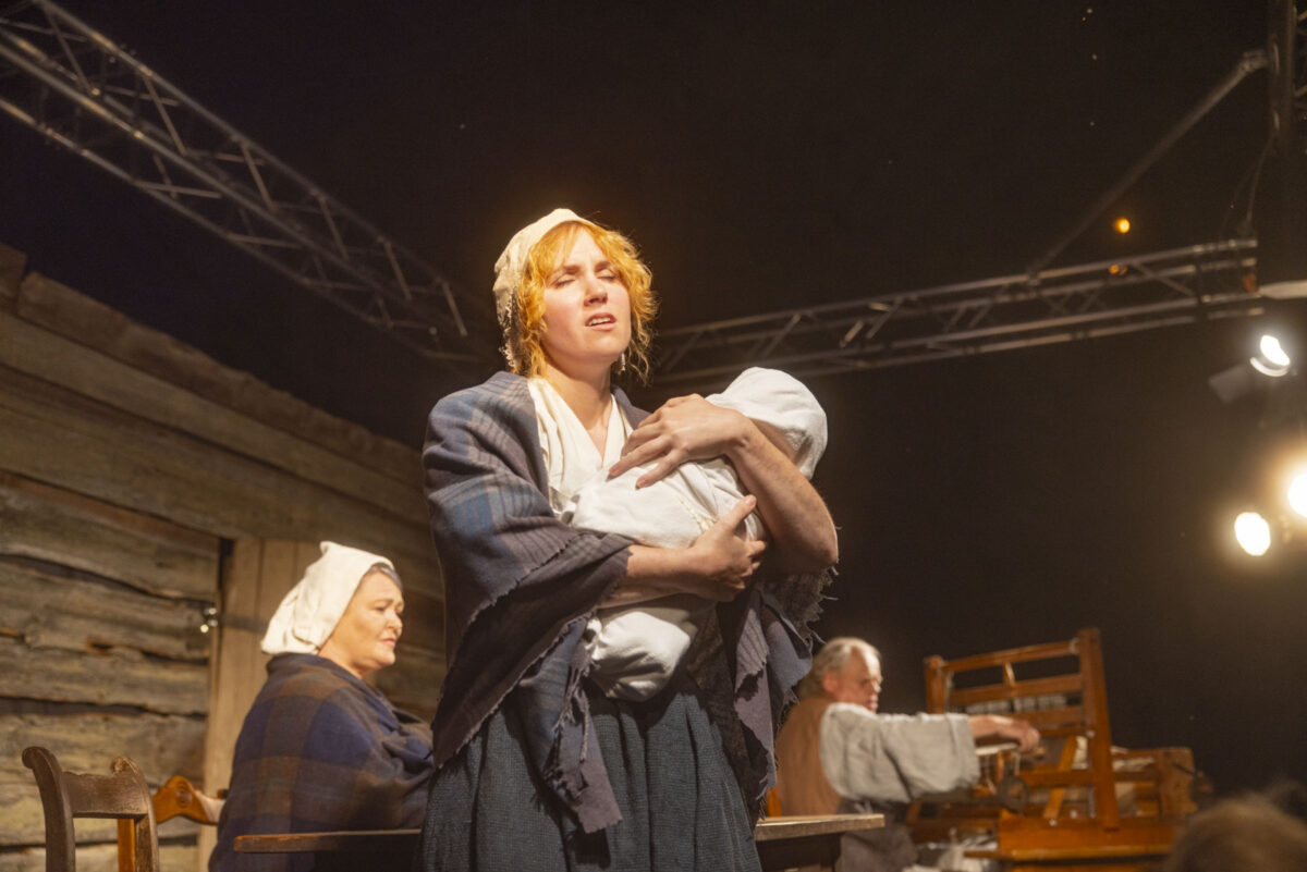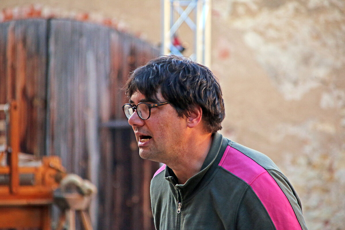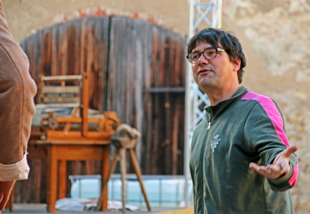 Ein Mann im Tunnel: Regisseur Till Rickelt hat jetzt keinen Nerv für ein Gruppenfoto. Erst muss der Text sitzen. Und das Spiel zurechtgerückt werden. Auf einer der beiden Bühnen vor einem Webstuhl sitzt Alois Hofherr.