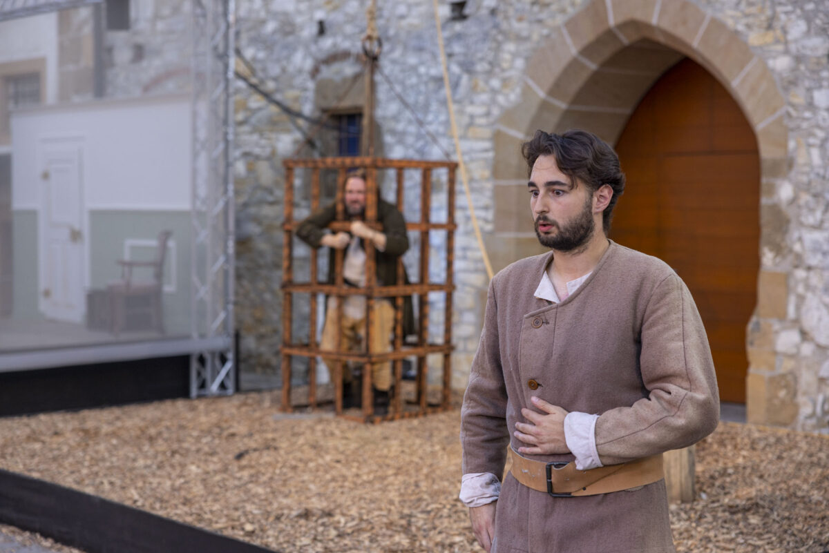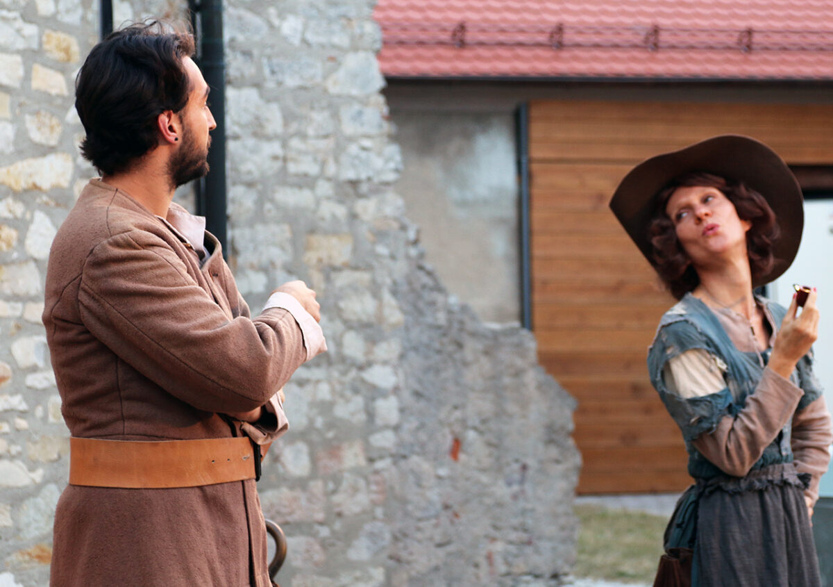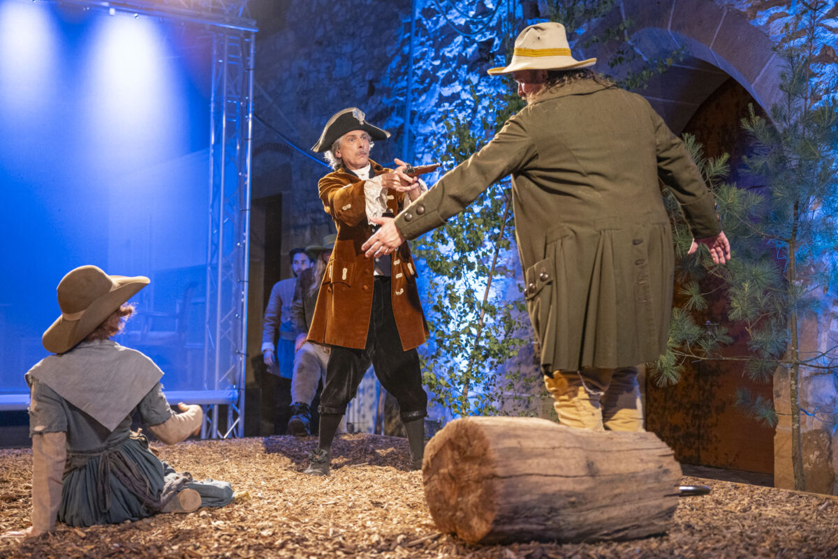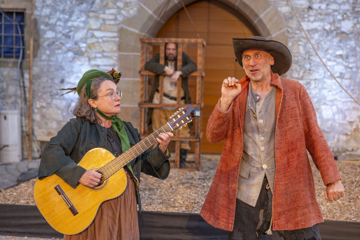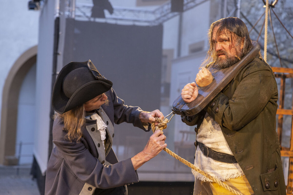 „Und jetzt schaust, was mit dem Rappen ist“, ordnet der Grafenstein an. „Ich erwarte, dass er wieder auftaucht.“ Der Gendarm schlägt die Hacken zusammen. „Zu Befehl, Euer Gnaden.“ Er schultert sein Gewehr, Laufschritt ab. Auf der Bühne sitzt der junge Karl. Offenbar ein Stürmer und Dränger der ersten Stunde. Noch kein Räuber, doch im Herzen ein Rebell. Er sinniert – und schreckt auf, als er merkt, dass er nicht allein ist. Ein Sprung rückwärts auf die Bühne. „Wer bist jetzt du?“, fragt er die Kundel, die beginnt, ihm schöne Augen zu machen.