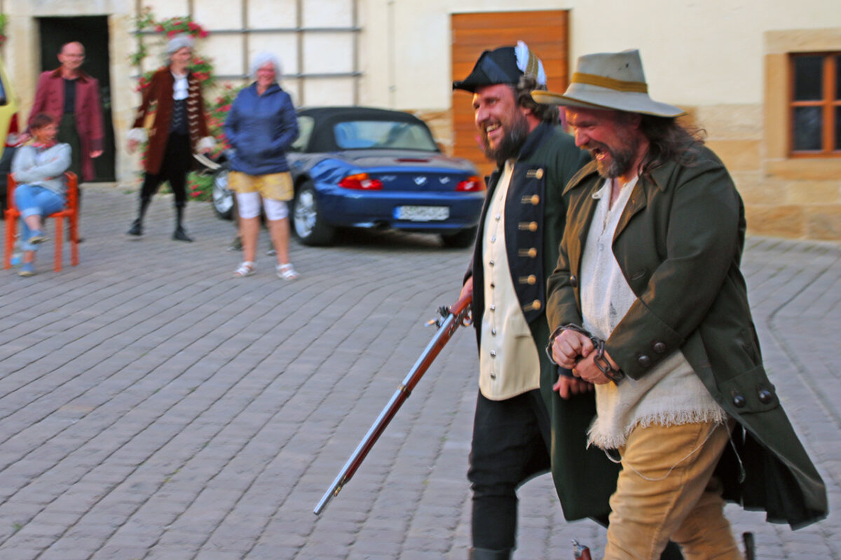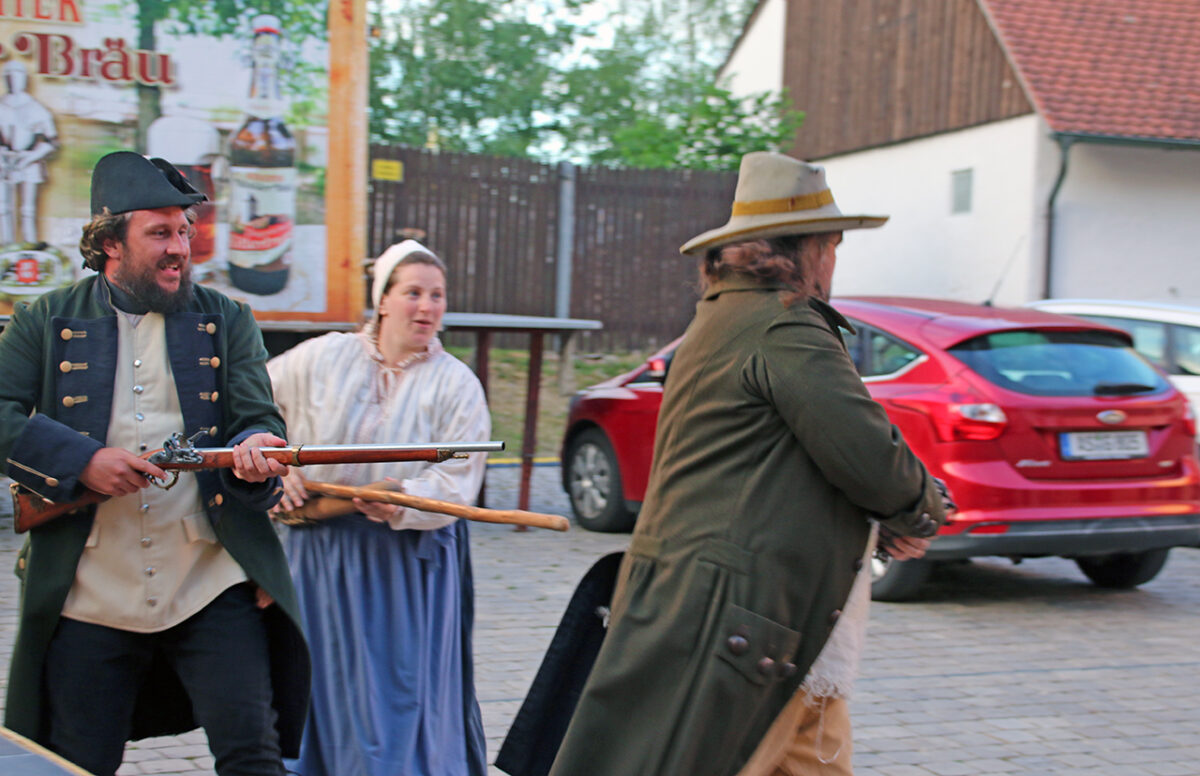Klar, dass das die Obrigkeit auf den Plan ruft. Josef Götz als der Centrichter von Grafenstein greift ein. Gestenreich und mit hochmütiger Miene macht der Grafenstein dem begriffsstutzigen Gendarmen Beine. „Schluss“, fühlt sich der Wachmann endlich angesprochen, „auseinander! Geht’s heim, Leutʼ – so was könnt‘s droben in Minga macha, aber ned bei uns.“ Das Volk spaziert, murrend, aber folgsam. An der Burgmauer lehnen ungerührt der Schwamma-Sepp und der Nürnberger. „Und ihr schaut’s, dass eich schleicht’s“, schimpft der Gendarm. „Hundsbagage elendigliche. Geht’s doch n`über nach Hahnbach, aufrührerisches Gsindel.“