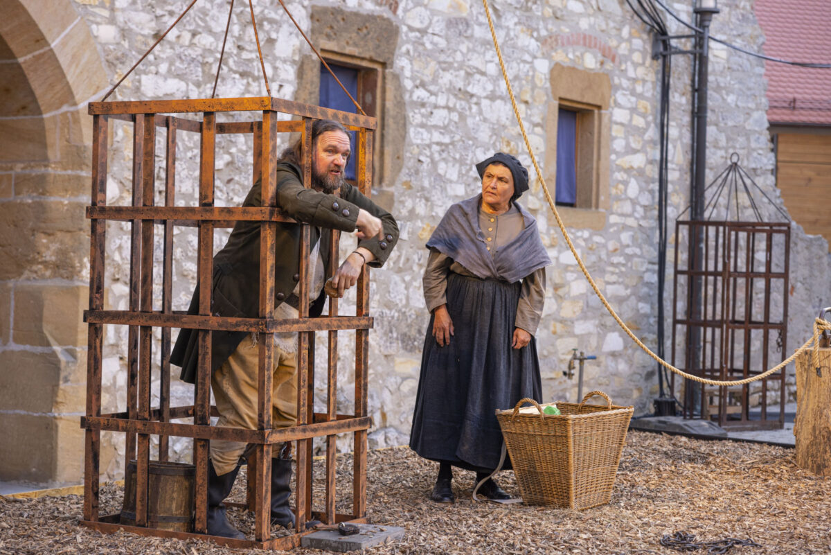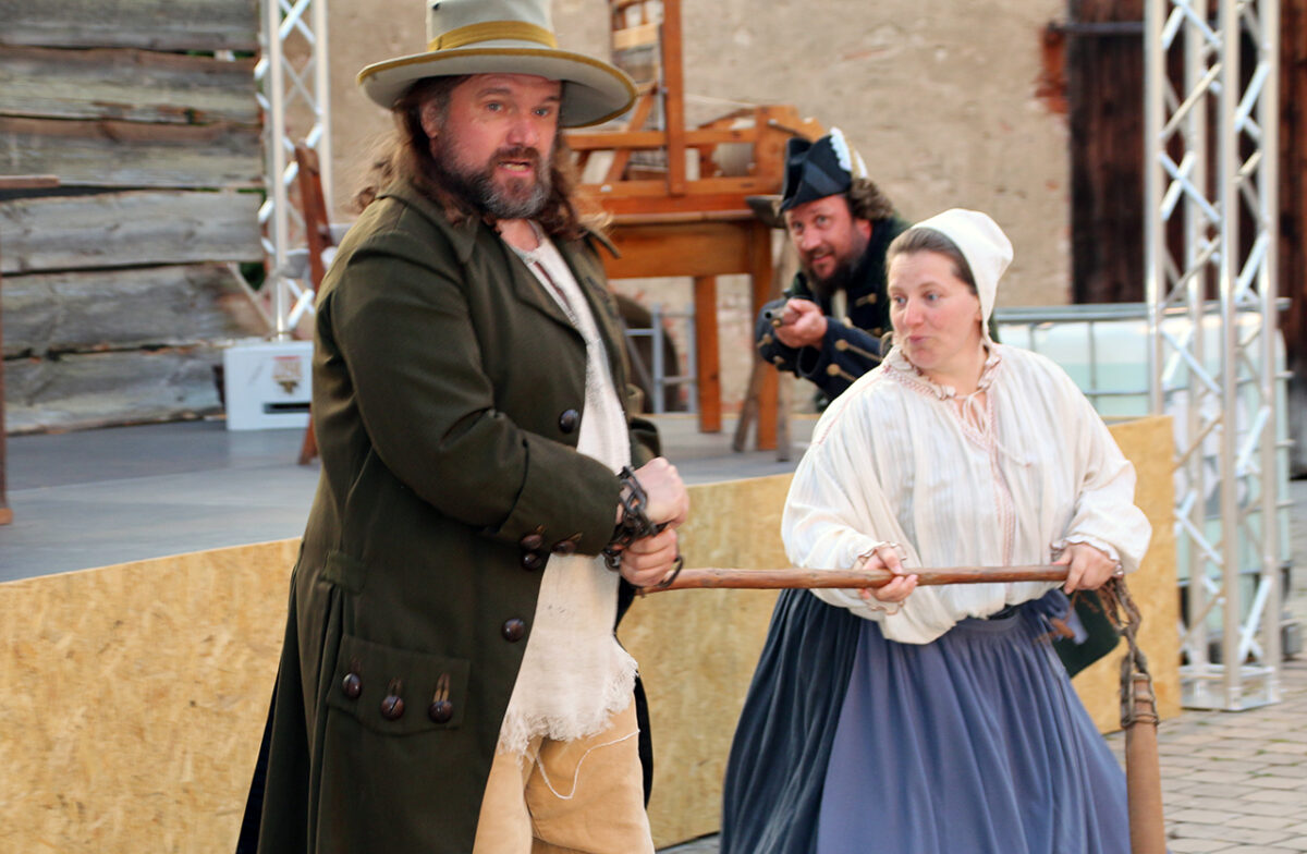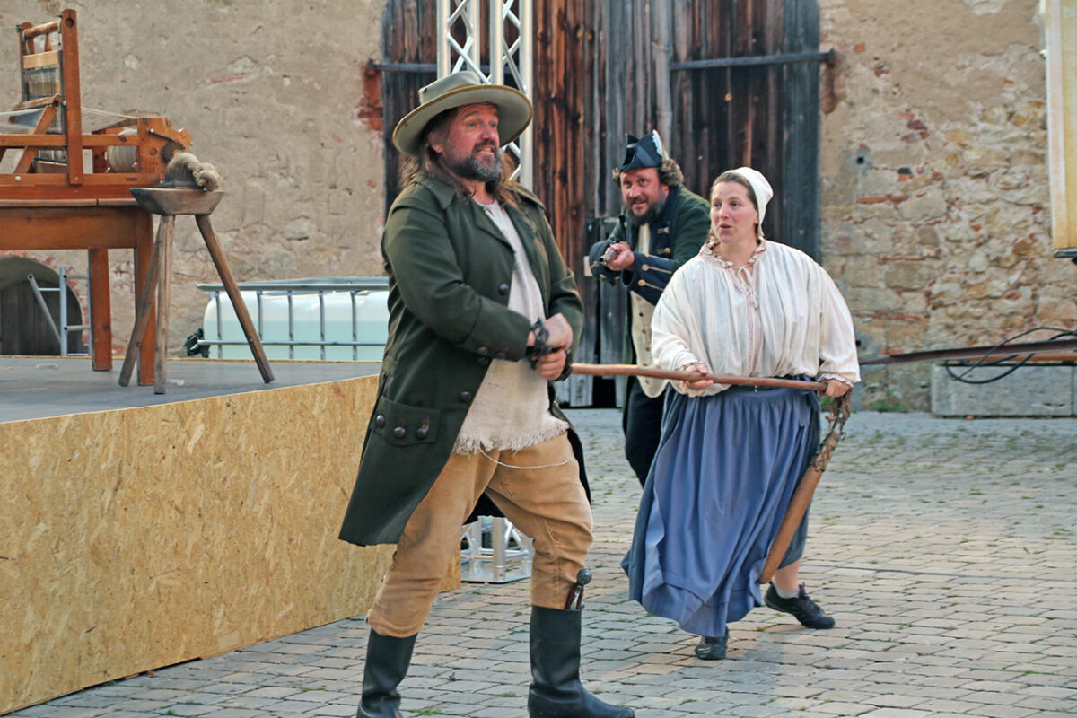 Den Auftritt der Bänklsänger Birnbeißer und Liesl mit dem Leierkasten und dem revolutionären Lied müssen wir uns jetzt halt denken. Das musikalische Duo ist nicht mit von der Partie. „Menschen, höret die Geschichte, die erst kürzlich ist gescheh’n. Drübn beim Franzmann musst der König, man glaubt’s kaum, auf einmal geh’n. Und zwar selber, ohne Sänfte, und zwar barfuß aufs Gestell. Und da wartet Monsieur Henker und der macht dann furchtbar schnell …“