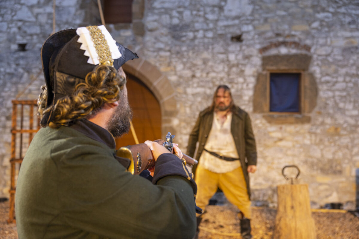 So, da muss der Regisseur noch mal ran. „Nicht so nah, der ist ja gefährlich, schon ein wenig Abstand.“ Rickelt zeigt dem Gendarm, wie Dirty Harry die Knarre halten würde. Jetzt will natürlich auch der Räuberboss wissen, was er in seiner misslichen Lage mit den Pistolen in seinen Stiefeln machen soll. „Abgeben?“ Also, wenn schon Entwaffnen, grübelt der Till, „dann müsst‘ma so ein Fluch-der-Karibik-Ding draus machen – eine Waffe raus, noch eine, noch eine …“