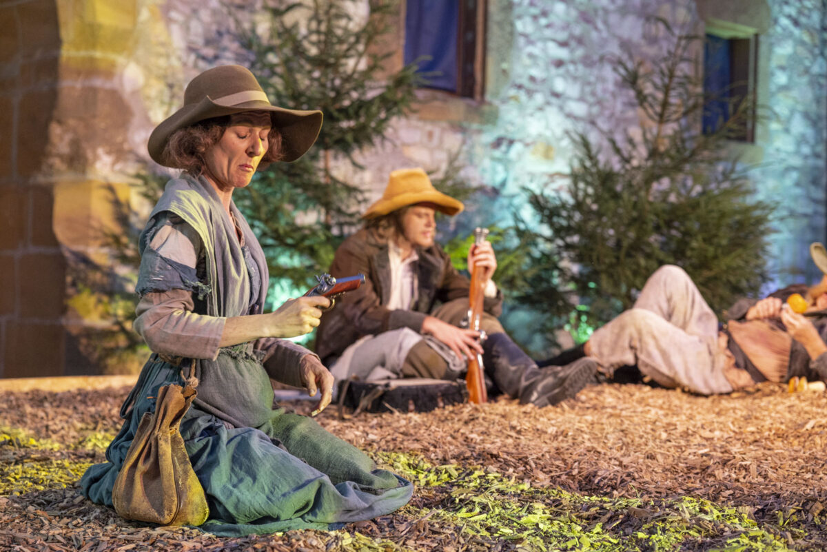 „Is egal“, winkt Regisseur Rickelt ab. „Einfach weiter, wir haben schon mal bei der Premiere ein Drittel gestrichen, im Zweifel einfach weiter, das bekommt man auch anders erklärt.“ Da fällt dem Karl ein Widerspruch auf. „Hast du ned gsagt, bei eich san alle gleich?“ Da will ihm ein Räuberhauptmann nicht ins Konzept passen. „Im Krieg braucht’s einen Anführer“, sagt die Kundel bestimmt. Marx hätte es nicht besser gesagt. Erst braucht‘s eben die Diktatur des Räuberiats, dann erst kommt die Freiheit. „Wo is er jetzt eigentlich euer Anführer?“ Mit stolz geschwellter Brust verkündet Kundel: „Ja hast du’s noch nicht bemerkt, er hat das besorgt, was uns noch gefehlt hat, ein Ross. Er ist halt ein richtiger Kerl, unser Franz.“