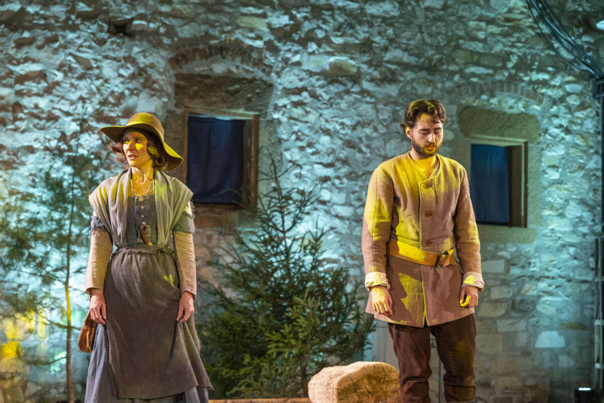Till Rickert dirigiert jetzt das scheinbare Chaos eines bunten Treibens am Vilsecker Marktplatz. Von links marschiert ein plauderndes Bauernpaar mit einem Korb Äpfel, von rechts ein Gruppe Bauern mit flüssigem Proviant. Alles redet durcheinander, Babylon ein Sinfonieorchester dagegen. Drei finstere Gestalten lauern im Hintergrund: der Schwamma Sepp (Josef Regner), Kundel (Christina Götz) und der Nürnberger (Jonas Dittrich). Sie mischen sich unters Volk, greifen in Körbe, stibitzen Äpfel, spitzen die Lippen zum gar nicht auffälligen Pfeifen im Walde.