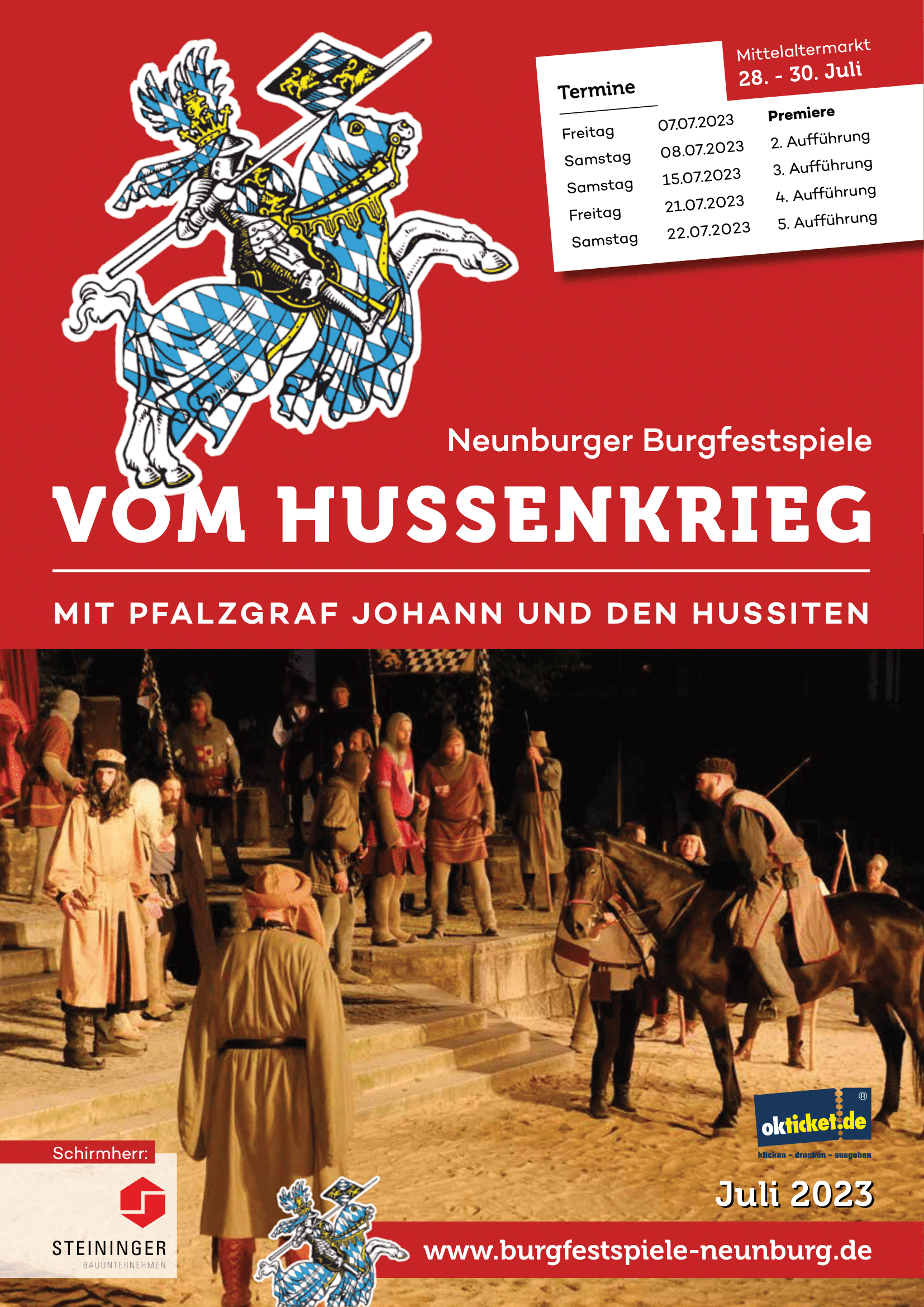 Basierend auf dem Urstück von Peter Klewitz hat Autorin Christina Fink dazu passend eine Neufassung des Stückes geschaffen, in der, gemäß dem Regiekonzept, die Figuren mit all ihren Emotionen und Konflikten im Vordergrund stehen. Die Gäste dürfen sich auf ein spannendes Stück im Oberpfälzer Dialekt freuen. Ein Stück, welches die Seele berührt, in dem jedoch auch der Humor nicht zu kurz kommt. Die Neunburger Burgfestspiele „Vom Hussenkrieg“ sind ein einzigartiges Erlebnis – Eine packende Reise in menschliche Abgründe vor dem Hintergrund eines bedeutsamen Kapitels deutsch-tschechischer Geschichte.