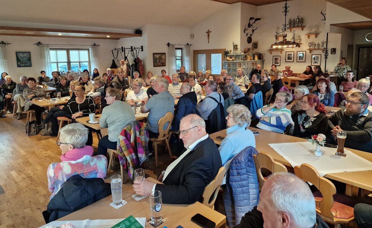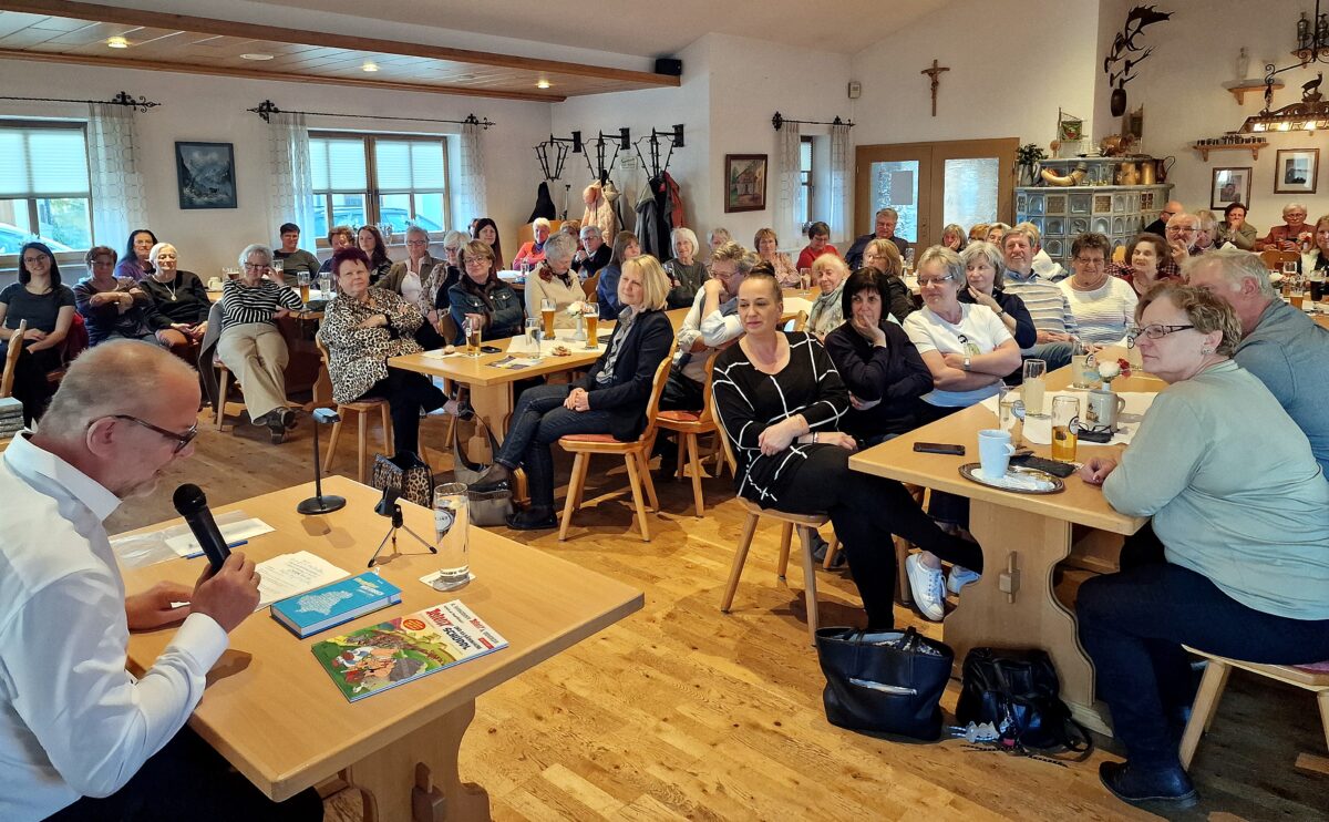 Gleich zu Beginn fragte der Autor ins Publikum, wie das Dialektwort des Jahres lautet. Die Antwort: „Uiala“ – ein Ausdruck aus der Reihe der -la-Wörter wie sodala, auala oder huschala, der Überraschung oder Schrecken ausdrückt. Vorgestellt wurde das Wort kürzlich von Bezirkstagspräsident Franz Löffler. Auf die Nachfrage nach dem Vorjahreswort kam prompt der Zuruf „miechad“ – abgeleitet von „mögen“.