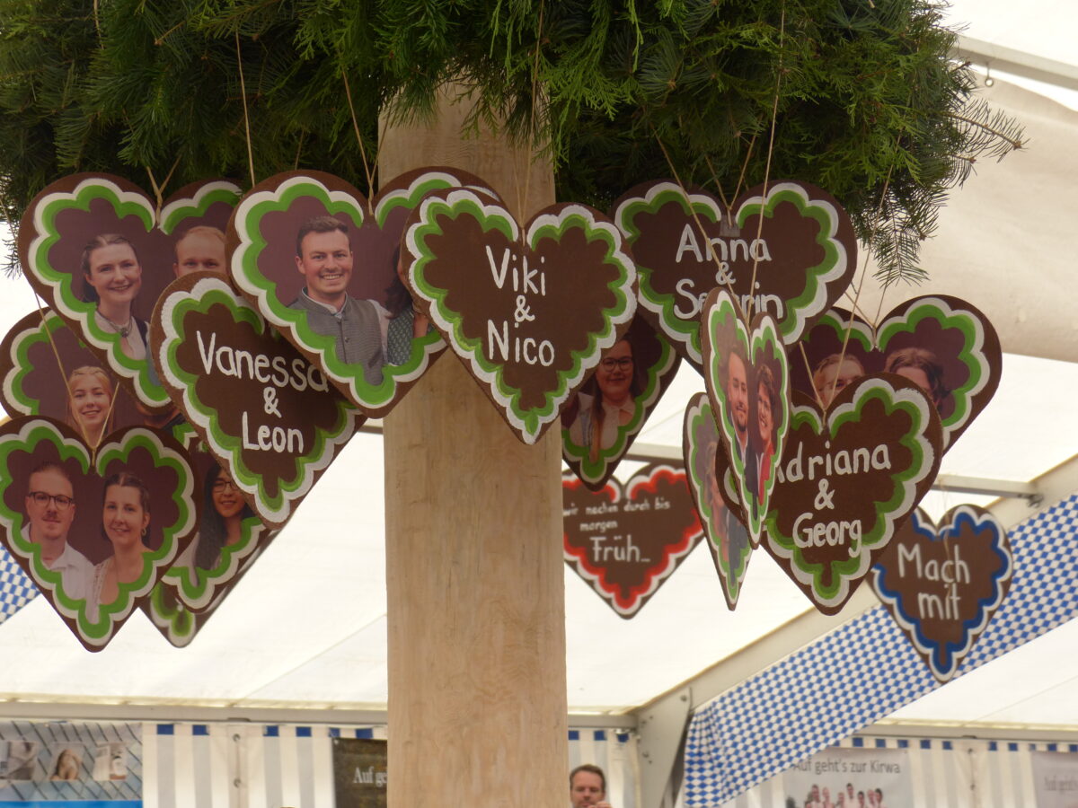 Nach dem erfolgreichen Kirwauftakt am Freitag feierten die Weiherhammerer im vollbesetzten Festzelt am Samstag weiter. Am Sonntagnachmittag war das Festzelt schon wieder voll und viele standen am Rand des Zeltes. Grund hierfür war das Kirwabaumaustanzen. Der Kirwabaum stand in der Zeltmitte bereit, war hübsch geschmückt und Herzen mit den Fotos der Kirwapaare waren dort aufgehangen.