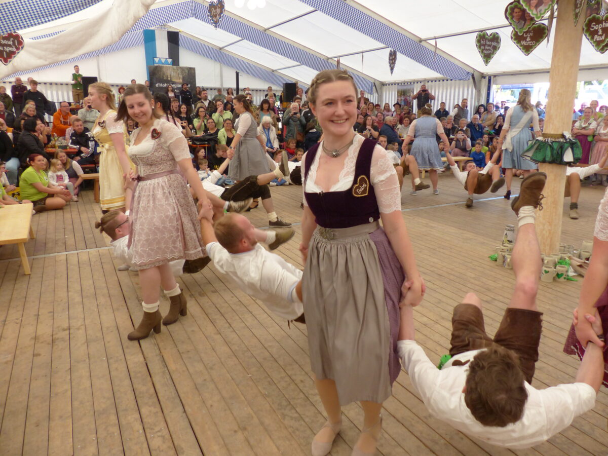 Das Kirwapaar wurde abwechselnd in die Luft geschleudert, aber wieder sicher aufgefangen. Das neue Oberkirwapaar übernahmen auch die Schleppen der Vorgänger als äußerliches Zeichen wer das Oberkirwapaar ist. Susanne Martin hat mit ihren Helferinnen alle Kirwatänze einstudiert, eine tolle Leistung. Mit dieser Steilvorlage wurde im Festzelt zünftig weitergefeiert.