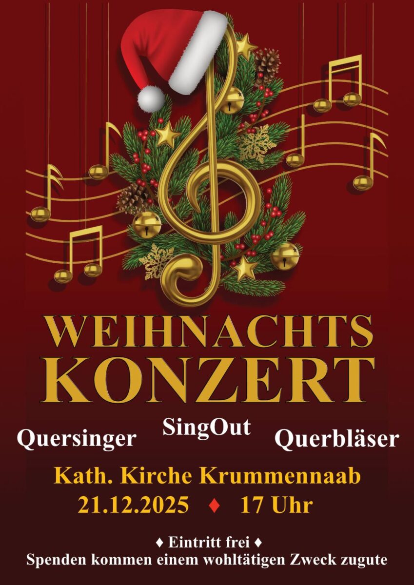 Es ist schon einige Jahre her, dass die Formation „Sing Out“ ein Weihnachtskonzert gegeben hat. Heuer ist es wieder so weit: Die fünf Sänger laden unter dem Titel „Weihnachten mit Sing Out & Friends“ zusammen mit dem Krummennaaber Frauenchor „Quersinger“ (unter der Leitung von Angelika Hederer) und den „Querbläsern“ (unter Leitung von Werner Hederer) zu einem gemeinsamen Weihnachtskonzert von Krummennaabern für Krummennaaber in die katholische Pfarrkirche ein.