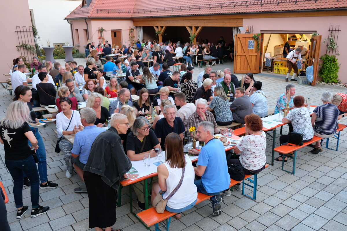 Die Veranstaltung, die am Samstagabend stattfand, bot nicht nur eine breite Auswahl an edlen Tropfen, sondern auch kulinarische Köstlichkeiten, die schnell die Herzen der Besucher eroberten. Ob spritziger Silvaner, vollmundiger Bacchus oder trockener Chardonnay – die Qual der Wahl hatte jeder, der sich durch die vielfältige Weinauswahl probieren wollte. Dazu gab es herzhafte Schmankerln wie Winzerteller, Wurstsalat, Obatzdn und Griebenschmalz-Brote, die von den Ladykrachern im Gardetempo serviert wurden.