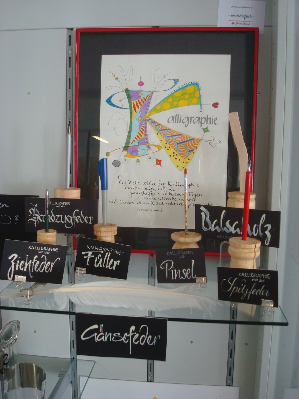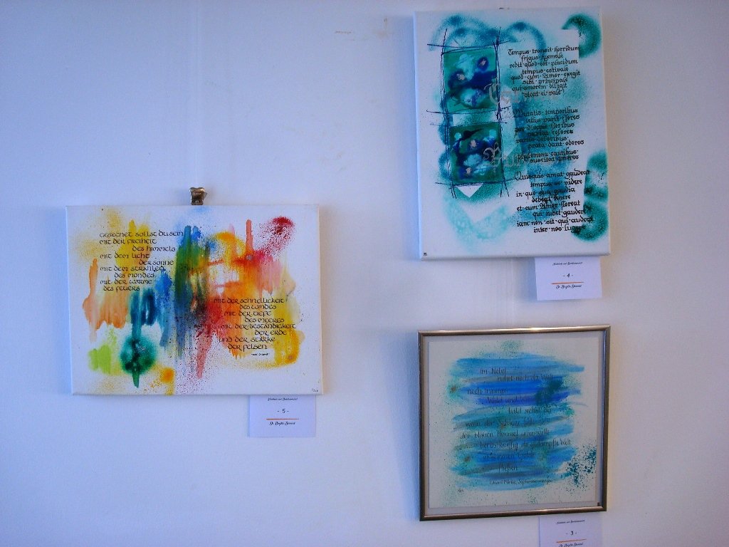 Aber nicht nur auf Schriften allein ist die Künstlerin fixiert, auch Karten oder Lesezeichen entstehen auf diese Weise. Inspiriert von ihrer künstlerischen Freundin Angelika Sticht hat sie auch einige Kalligraphin mit kleinen künstlerischen Werken bereichert. Die Kunst des schönen Schreibens wird so auf unglaubliche und vielfältige Weise dargestellt.