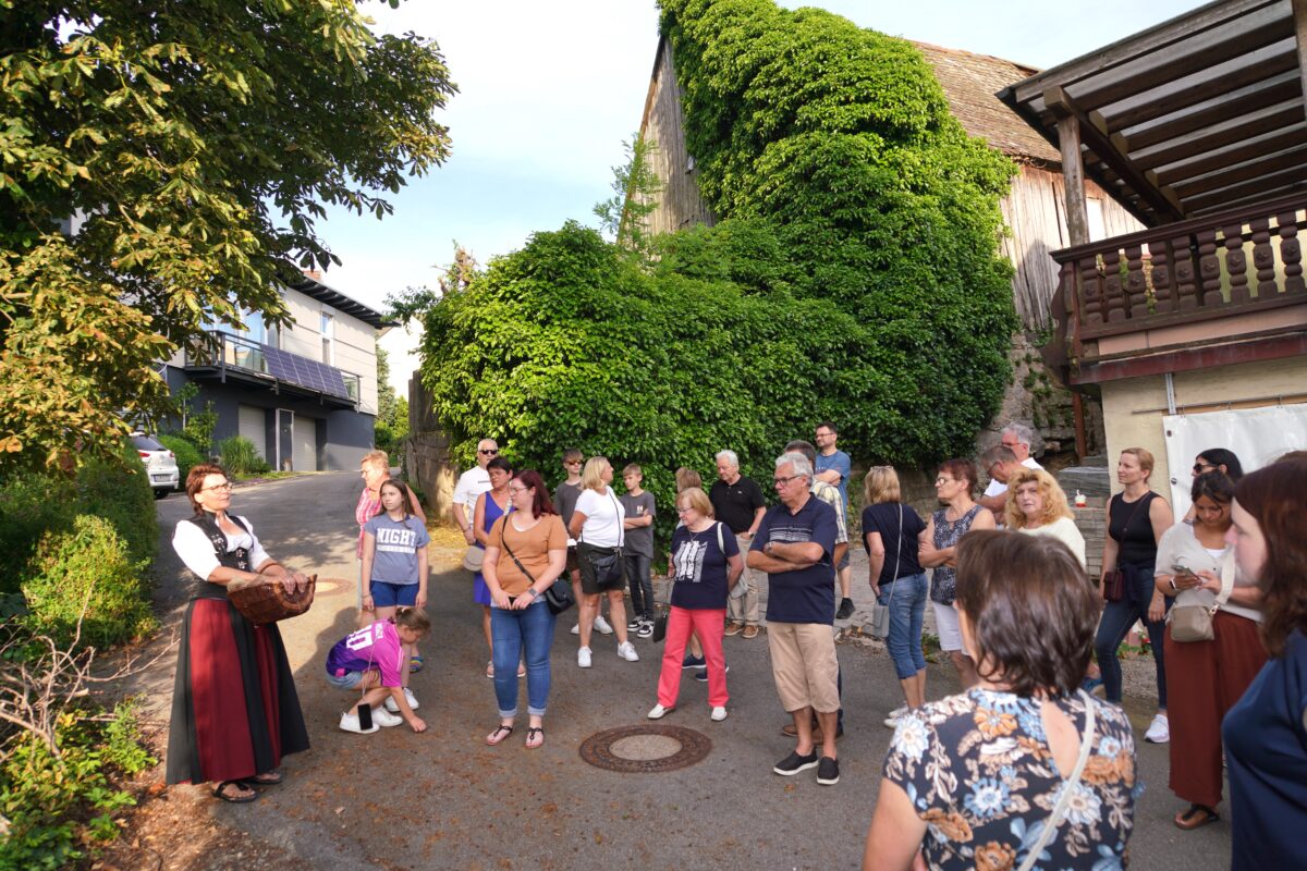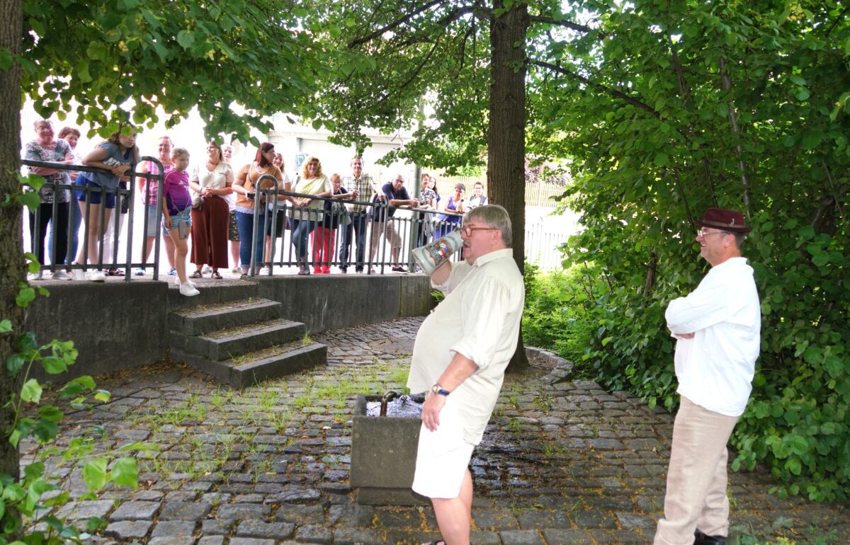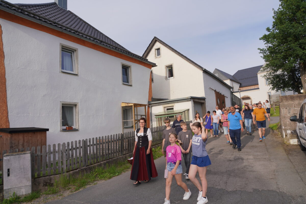 Die Magd Andrea (Andrea Götz) und das LANDKULTUR – Team machten bei den einzelnen Stationen für die über 50 Interessierten Momente der reichen Geschichte von Waldthurn erlebbar. Die Magd sprach am Startpunkt der Tour, am Lobkowitzschloss von der ersten urkundlichen Erwähnung des Marktes vor 807 Jahren und der Markterhebung vor knapp 500 Jahren. „Wir wollen euch heute in eine andere Zeit entführen, spazieren markante Punkte der Marktgeschichte ab und lassen uns überraschen, wer uns begegnet“.