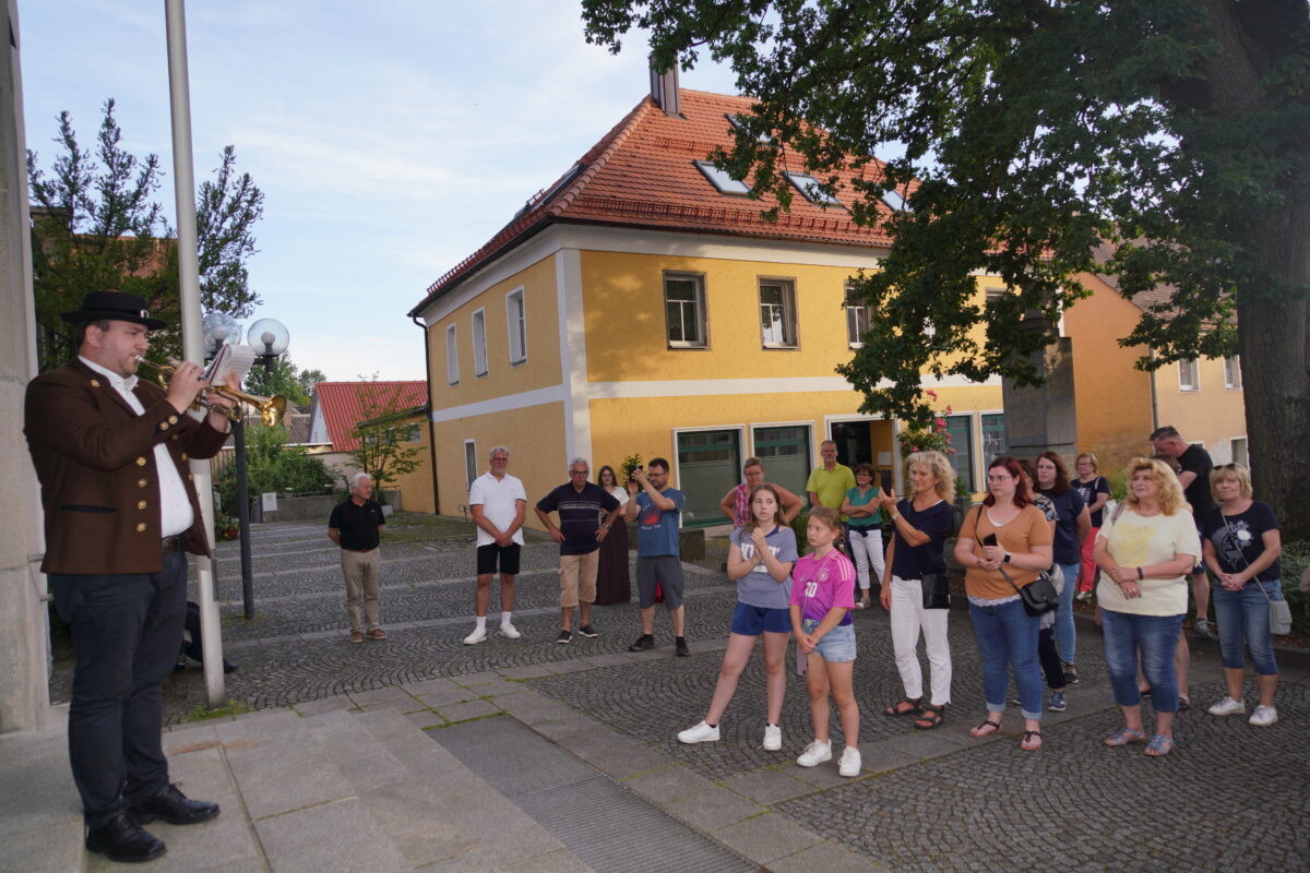 Den Schlusspunkt setzte am Eingang zur Pfarrkirche der Türmer (Felix Griesbach), der schon von weitem mit seiner Trompete zu hören war. Er berichtete, dass schon 1582 das erste Mal sein Berufsstand erwähnt wurde. Seine Hauptaufgabe war der Wach- und Musizierdienst. Nach diesem von Andrea Götz und Georg Schmidbauer kreierten Geschichtsspaziergang bot die Kolpinggruppe entsprechende Stärkung in Form von Würstln und Getränken.