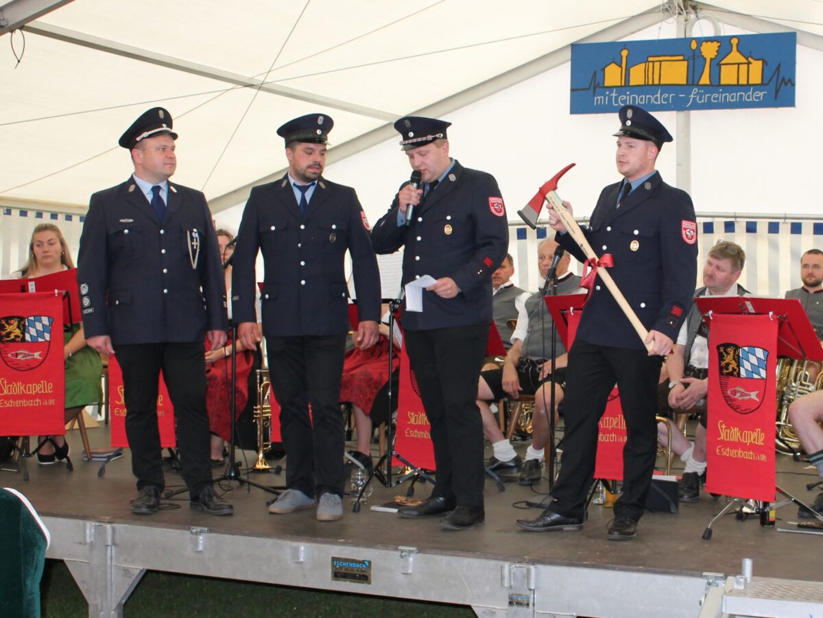 Beim anschließenden geselligen Nachmittag mit der Eschenbacher Stadtkapelle übergab die Feuerwehr Burkhardsreuth als Patenverein den Zessauer und Weihersberger Kameraden „etwas zum Löschen“ und eine Feuerwehraxt, die notfalls auch als Flaschenöffner tauge, und die Floßer Schützengesellschaft brachte den Jubilaren von „Eichenlaub“ eine Bild- und Textcollage zur Erinnerung an das Patenbitten in Floß mit.