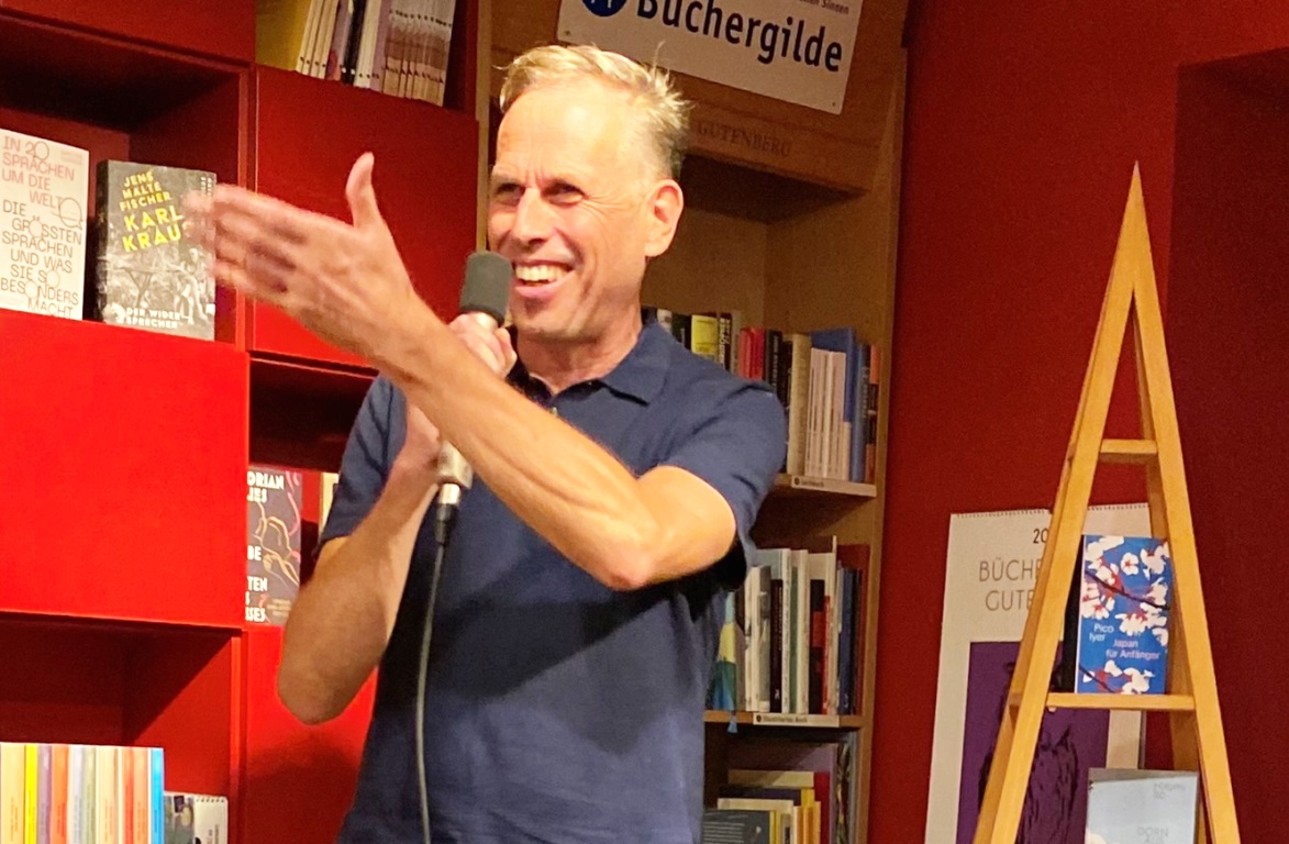 57 ist Bogdahn mittlerweile. Und dass es so lange gedauert hat mit seinem Debüt als Buchautor, das erzählt er hier vor ausverkauftem Haus in für ihn typischer Weise: Beim Hochfahren – Achim Bogdahn setzte schon lange vor dem Neuneuroticket auf die Bahncard100 – saß er einem jungen Typen gegenüber, der als Bodenleger in Landshut arbeitet und sich am Wochenende in Regensburg von Mama verköstigen lässt. Der hatte dem Achim auch diese Frage gestellt. Und erhielt als Antwort, dass er als Radiojournalist einfach immer ganz ganz viel zu tun gehabt hätte. Außerdem sei er ja dreifacher Familienvater.