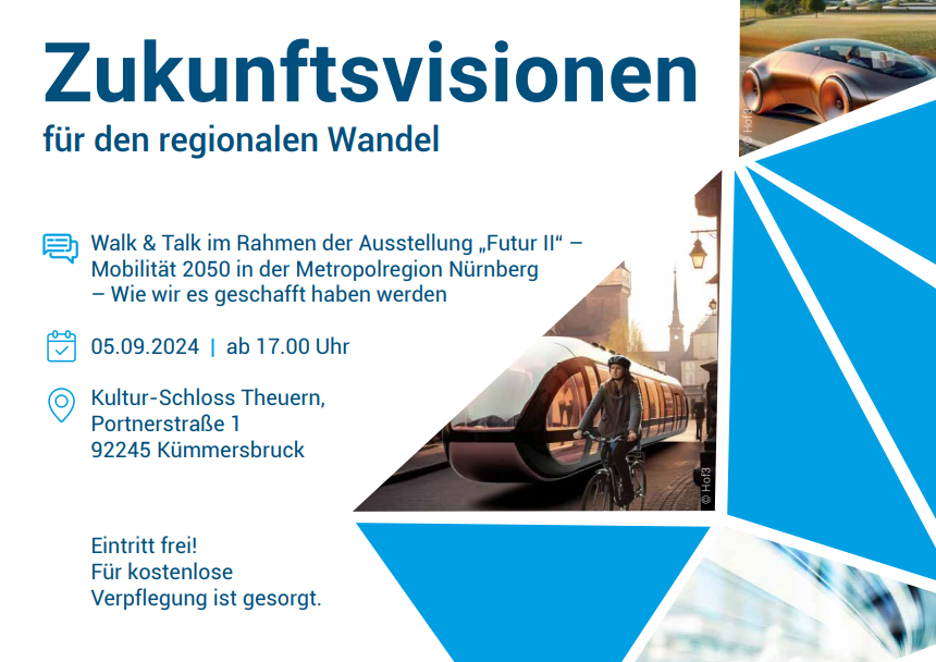 Kümmersbruck lädt unter dem Motto “Walk and Talk” zu einem einzigartigen Rundgang ein. Am Donnerstag, dem 5. September, wird im Kultur-Schloss Theuern die Sonderausstellung “Futur II – Mobilität in der Metropolregion Nürnberg 2050 – wie wir es geschafft haben werden” präsentiert. Dieser geführte Rundgang bietet die Möglichkeit, mit Politikern, regionalen Unternehmern und Fachexperten über den regionalen Wandel der Wirtschaft ins Gespräch zu kommen. “Während der Führung können Interessierte mit Politikern, regionalen Unternehmern und Fachexperten ins Gespräch kommen und sich über Fragen, Gedanken oder auch Zukunftswünsche zu den Themen Wandel in der Mobilität, Wandel in der Arbeitswelt und Wandel in der Region austauschen.” Die Veranstaltung beginnt um 17 Uhr und wird etwa 90 Minuten dauern. Der Eintritt ist frei, und es wird keine Anmeldung benötigt.