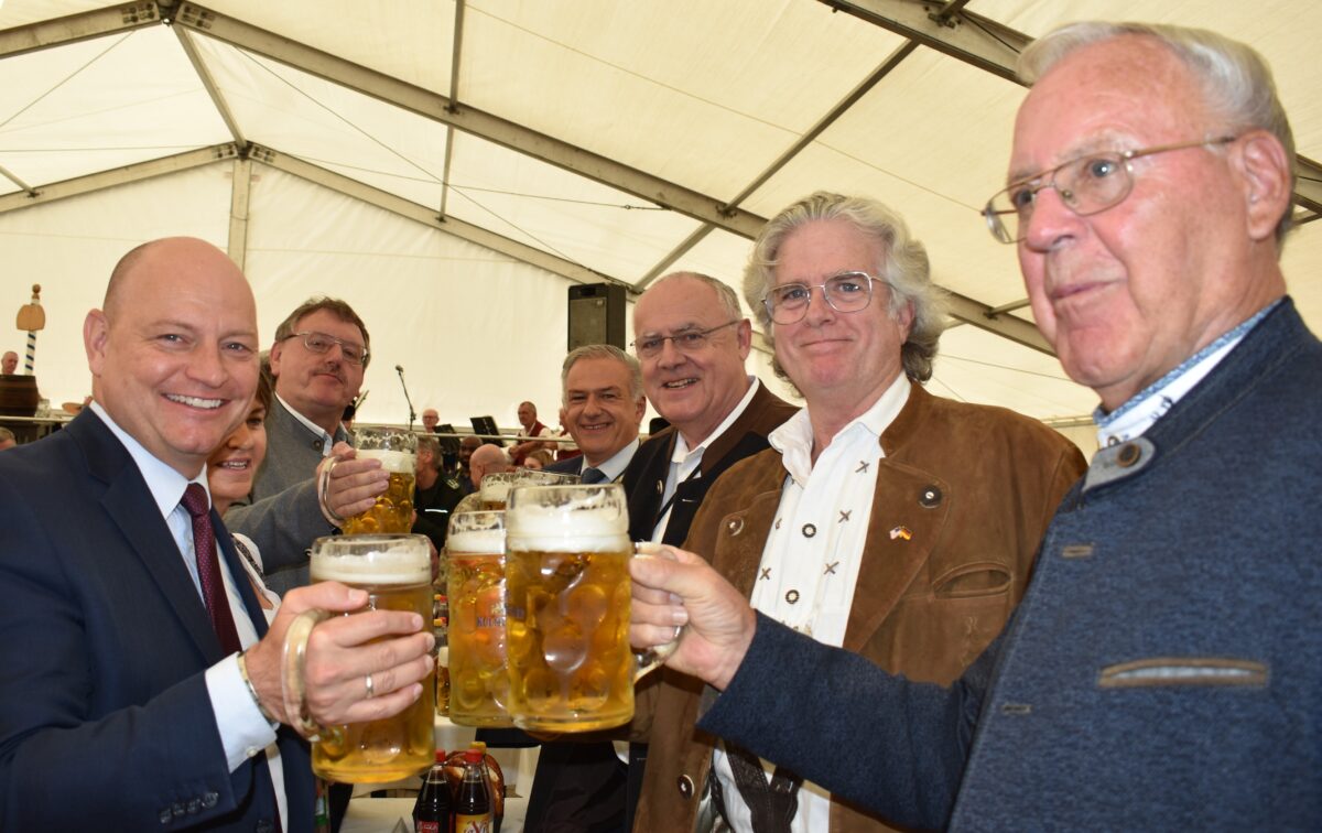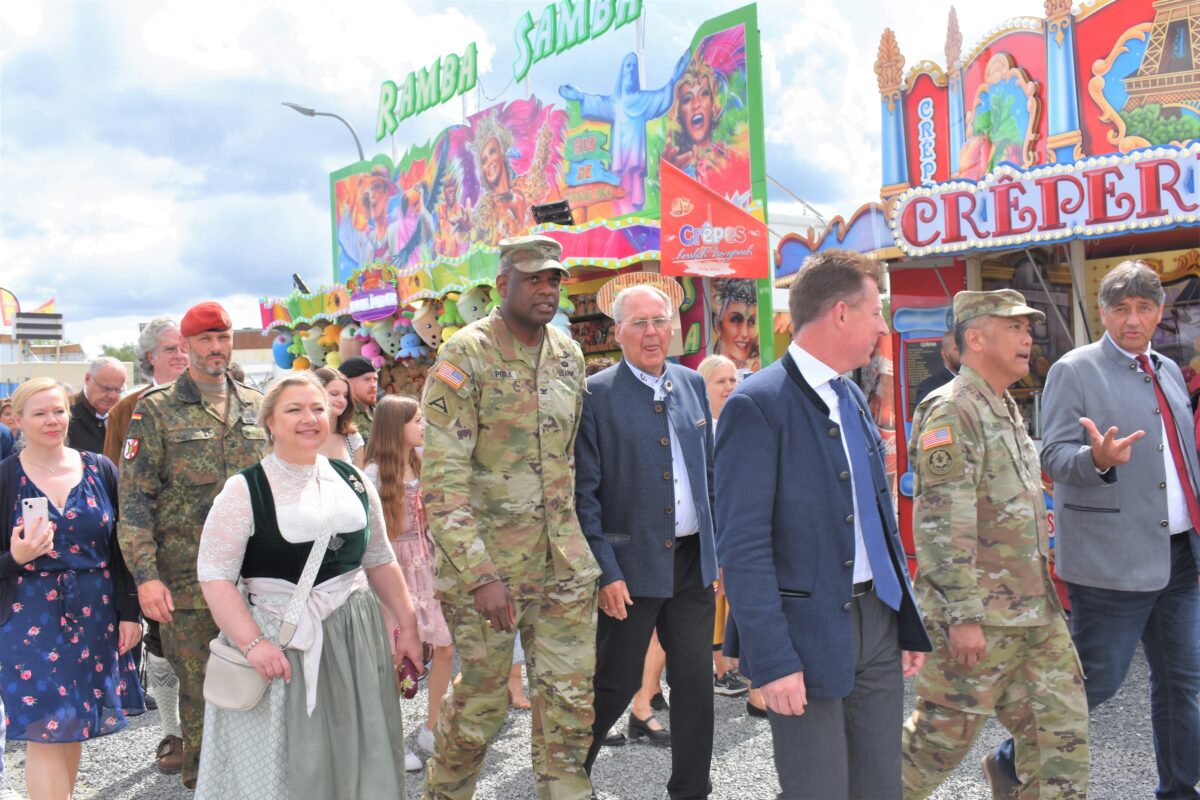 Schnipp schnapp: Mit dem Durchschneiden des roten Bandes von NATO-Oberbefehlshaber Christopher G. Cavoli, Brigadegeneral Steven P. Carpenter, Bürgermeister Edgar Knobloch und DAGA-Präsident Helmuth Wächter wurde am Freitag das Volksfest eröffnet. Mit einem “Servus” hieß der Garnisonskommandeur Colonel Kevin A. Poole die Gäste im Festzelt willkommen. Man merkte, dass dieses Fest ihm ein Herzensanliegen ist. “Es ist schön, Sie alle heute hier wiederzusehen nach der dreijährigen Pandemiepause.” Er übermittelte auch die Grüße des bayerischen Innenministers Joachim Herrmann. Der war terminlich verhindert und konnte nicht dabei sein.