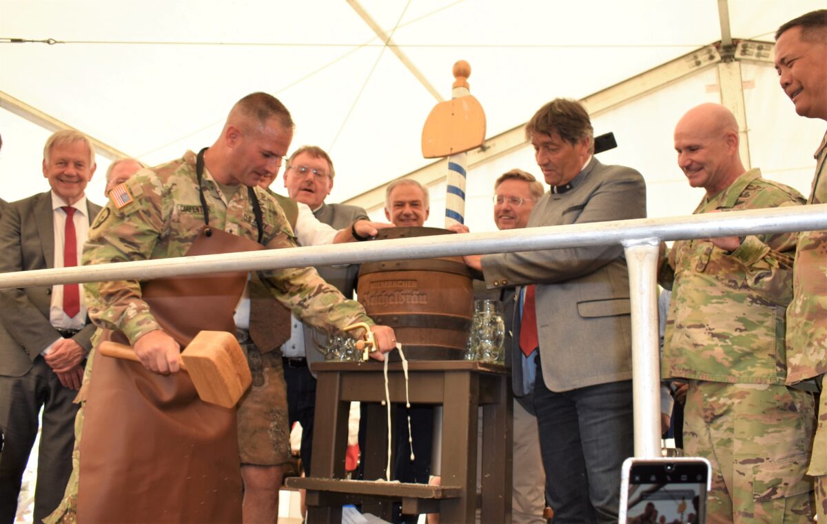 Danach wartete eine wichtige Aufgabe auf Brigadegeneral Carpenter: das Anzapfen des Bierfasses. Er schaffte das souverän: Nach nur zwei Schlägen floss der Gerstensaft aus dem Zapfhahn.
