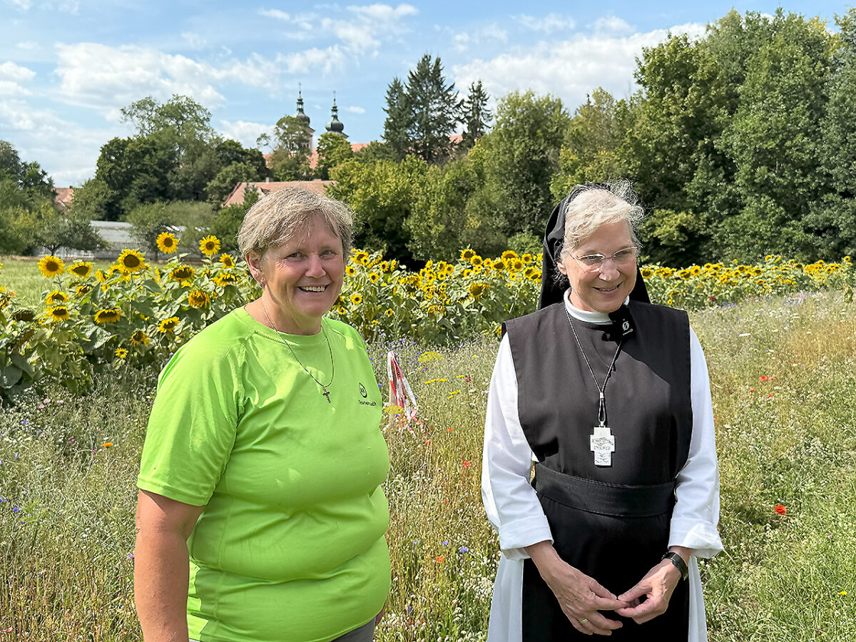 In einem Wildwiesenstück stehen Monika Keck vom Maschinenring und die Äbtissin zwischen Königskerze, Fuchsschwanz und Kornblume. „Wir wollten mehr Blühendes“, sagt Keck, „für die Bienen – aber auch für die Seele.“ Die Blumenwiese ist Nährboden für Geschichten: „Aus Mohnblüten haben wir früher Püppchen gemacht“, sagt die Äbtissin und lächelt. „Oder tränende Herzen: Wenn man sie umdreht, sieht das aus wie ein Männchen in der Badewanne.“