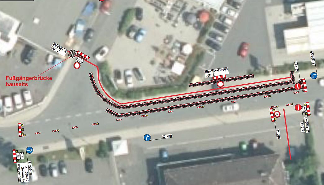 Bei der Unteren Bauscherstraße ist eine halbseitige Sperrung mit eingerichtetem Fußgängernotweg erforderlich. In östliche Fahrtrichtung ist die Untere Bauscherstraße für Fahrzeuge weiterhin passierbar.