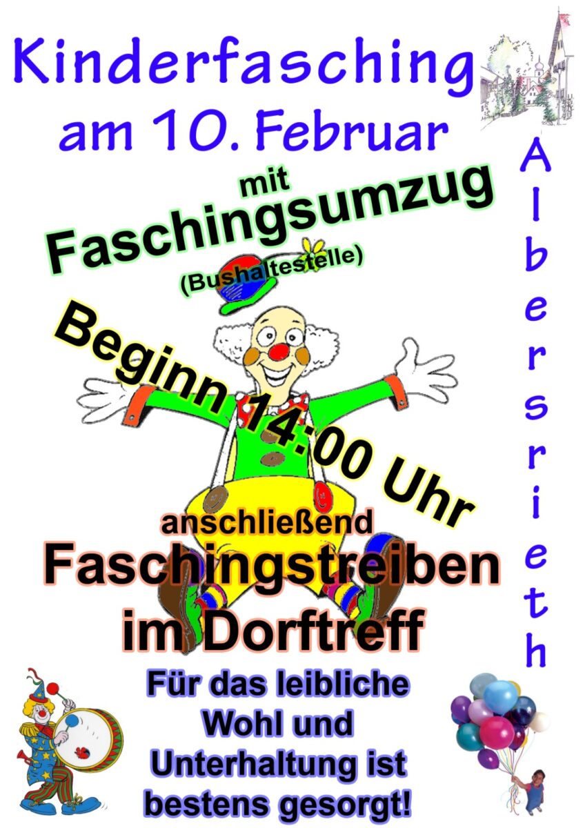 Die Dorfgemeinschaft Albersrieth lädt für kommenden Freitag ab 20 Uhr zum traditionellen Hausfasching im Dorftreff ein. Um die passenden musikalischen Töne zum Zuhören, Mitschunkeln und Tanzen kümmert sich DJ Andreas. In der Galerie-Bar können die Gäste auf die zu Ende gehende närrische Fünfte Jahreszeit anstoßen. Für Speis’ und Trank ist beim Albersriether Dorffasching ausreichend gesorgt. Der Eintritt zum närrischen Treiben ist frei.