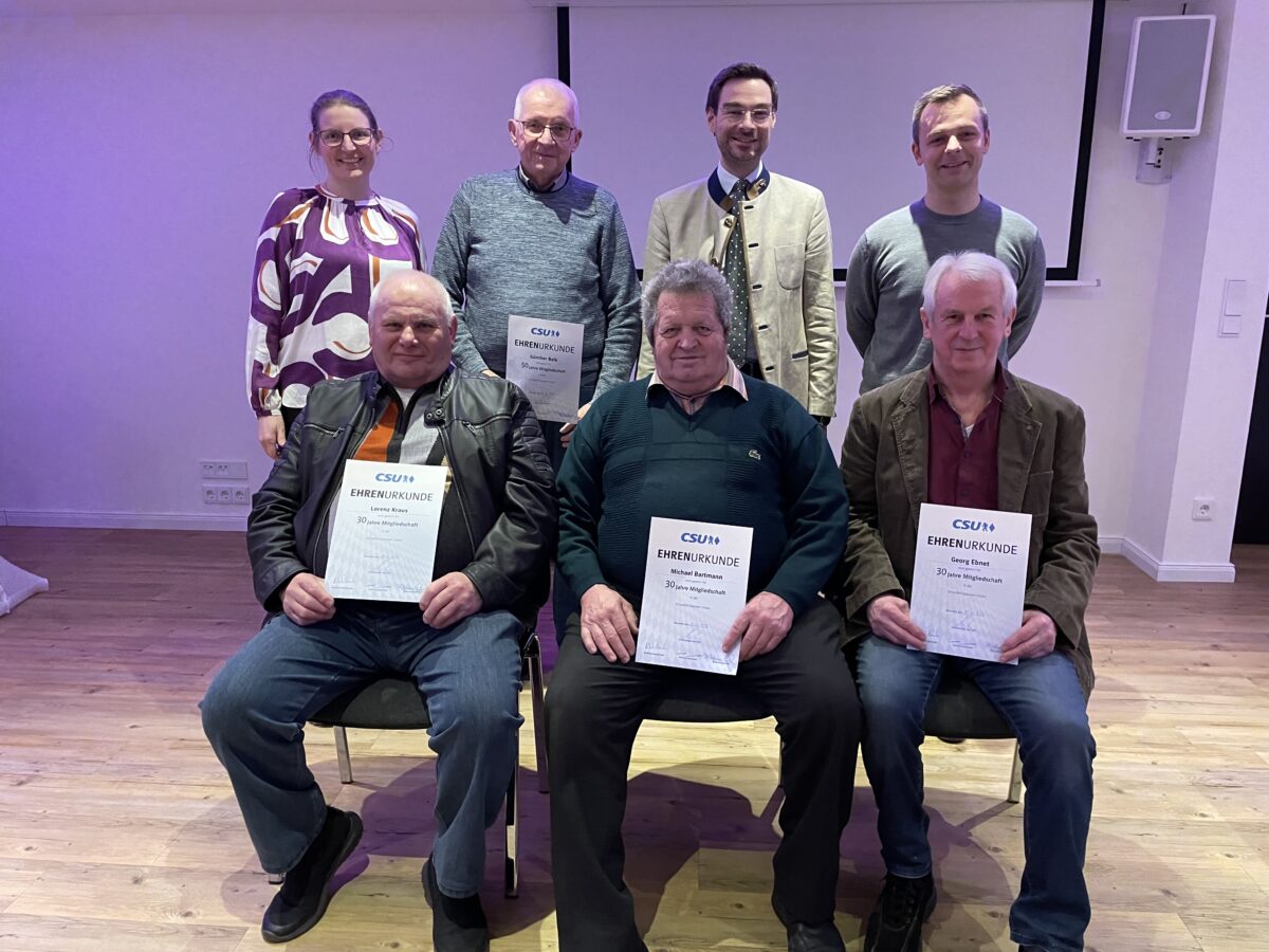Ein halbes Jahrhundert Treue wie bei Günther Balk erlebt man nicht alle Tage, auch Franz Brandl gehört so lange der CSU an. Er konnte ebenso wie Josef Götz, der für 40 Jahre Mitgliedschaft geehrt wurde, nicht dabei sein. Am selben Tag der CSU beigetreten sind Lorenz Kraus, Michael Bartmann und Georg Ebnet, vor etwas mehr als 30 Jahren hieß es damals „wenn, dann gemeinsam“. Auch Christa Kraus und Jürgen Bächtle sind nun bereits seit drei Jahrzehnten Mitglied. Für 15 Jahre Mitgliedschaft wurde der Fraktionsvorsitzende Thomas Bäuml geehrt.