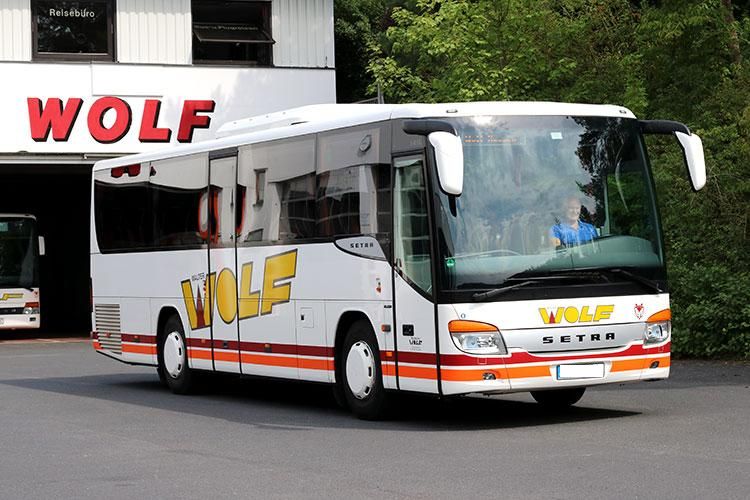 Abfahrt mit dem Omnibus der Firma Wolf: