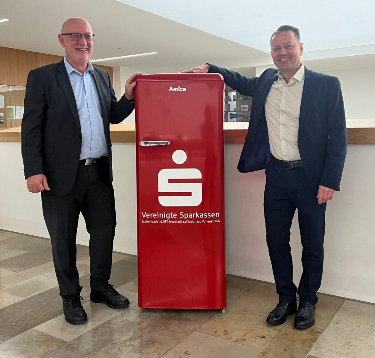Neustadt/WN. Die Vereinigte Sparkassen Eschenbach i.d.OPf. Neustadt a.d. Waldnaab Vohenstrauß unterstützt seit ihrer Gründung Einrichtungen und Organisationen im Geschäftsgebiet. So wurde dem Gymnasium Neustadt ein roter Kühlschrank gespendet, der durch das Sparkassen-Logo geziert wird.