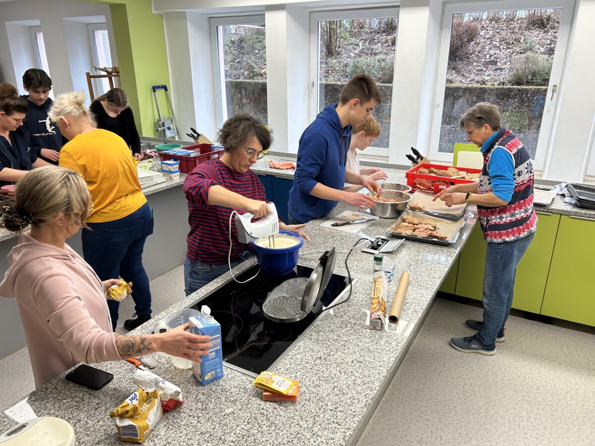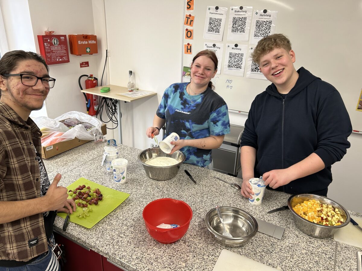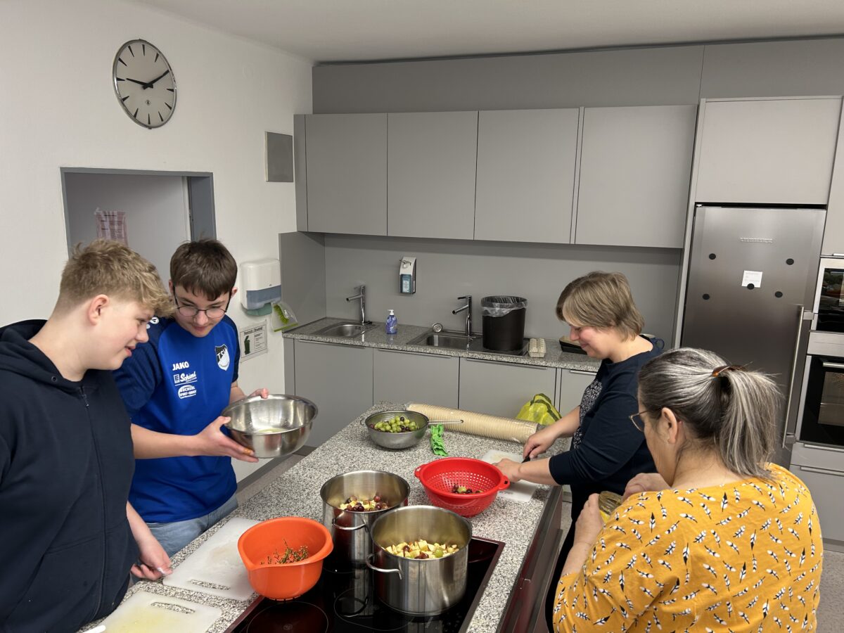 Die Klasse 8a verarbeitete mit den Mitgliedern des Elternbeirats unter Vorsitz von Marina Koller und Christopher Linkel Obst und Gemüse gekonnt und mit viel Freude zu leckerem Salat und Sticks mit Dip.