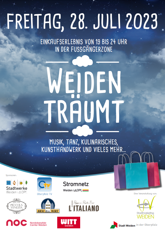 Das Stadtmarketing und die Stadt Weiden bedanken sich für das Verständnis der Anwohner und freuen sich auf eine gelungene Kultur- und Einkaufsnacht. Weitere Informationen und den gesamten Flyer finden Sie auf der Homepage www.stadtmarketing-weiden.de und auf der Facebook-Seite.