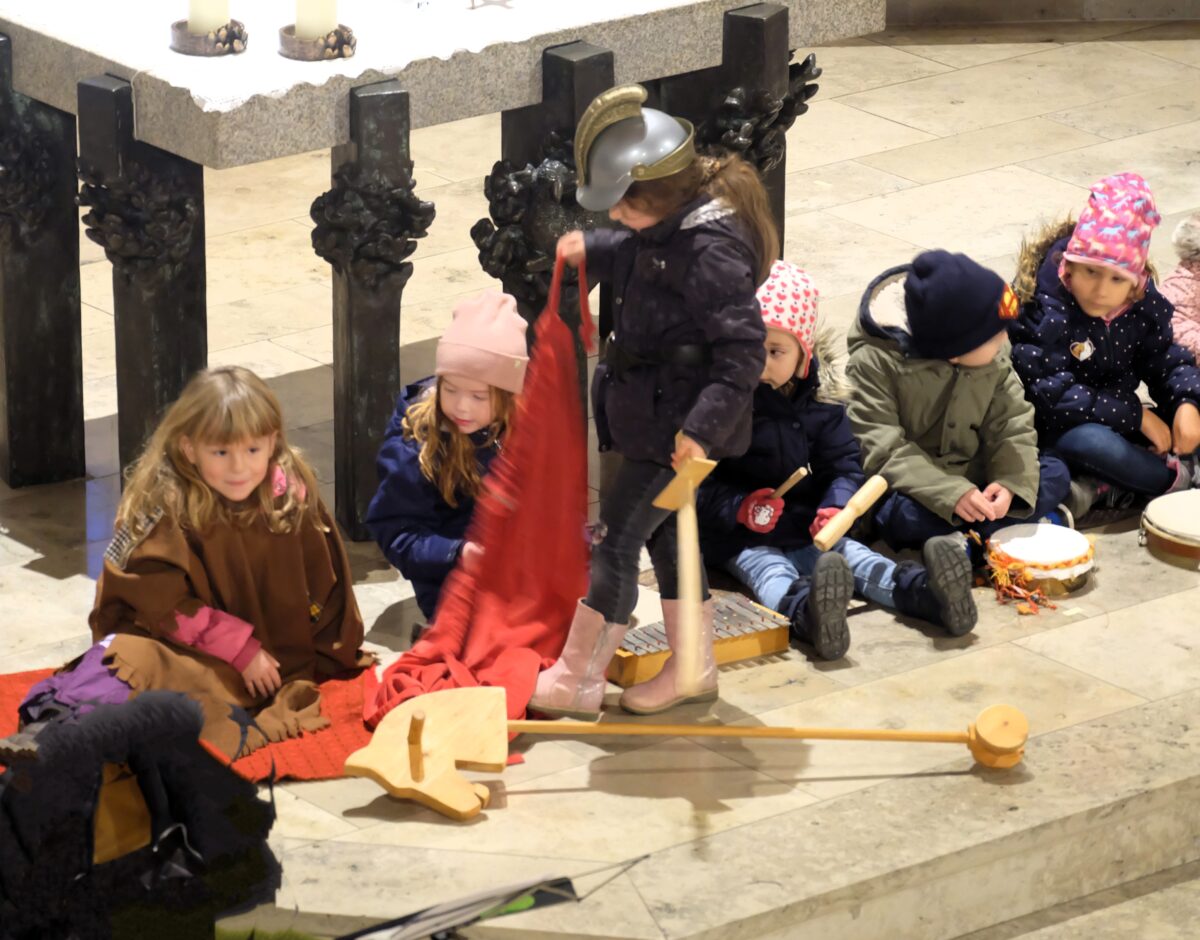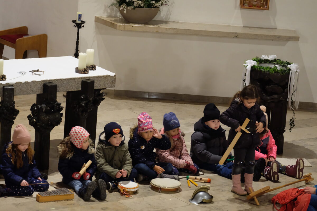 Sonodrum und Gitarre waren die begleitenden Instrumente für die Martinslieder, die die Kinder lauthals und voller Freude mitsangen. Für die Darstellung der Mantelteilung in einem Spiel und einem Laternentanz um den Altar gab es kräftigen Applaus von den Eltern, Geschwistern und Omas und Opas, die alle Bänke in der Kirche bis auf den letzten Platz ausfüllten.