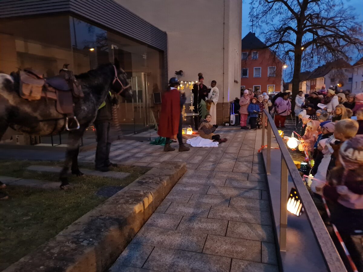 Nach dem Abschlusslied „Wir leuchten hell wie Sterne“ und dem Segen ritten der heilige Martin (Sina Wölfl) mit dem zunächst scheuen Pferd und der Bettler (Alina Wölfl) mit dem Pony dem Laternenzug voran. Auf dem Marktplatz schufen Lichter in den Fenstern eine besondere Atmosphäre. Warme Wiener, Glühwein und Kinderpunsch, serviert vom Elternbeirat, waren dann am Kindergarten gefragt.