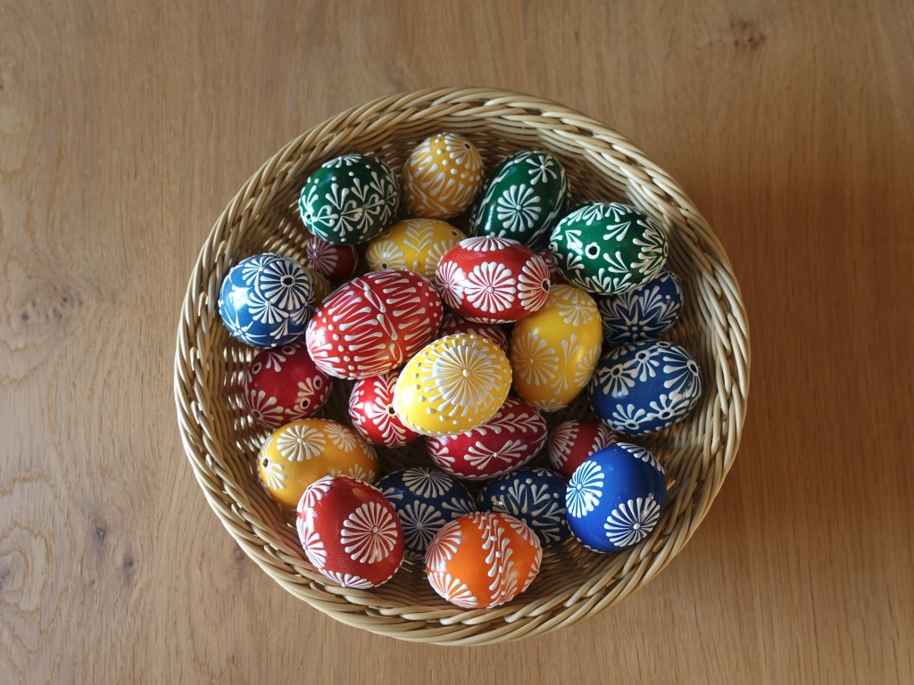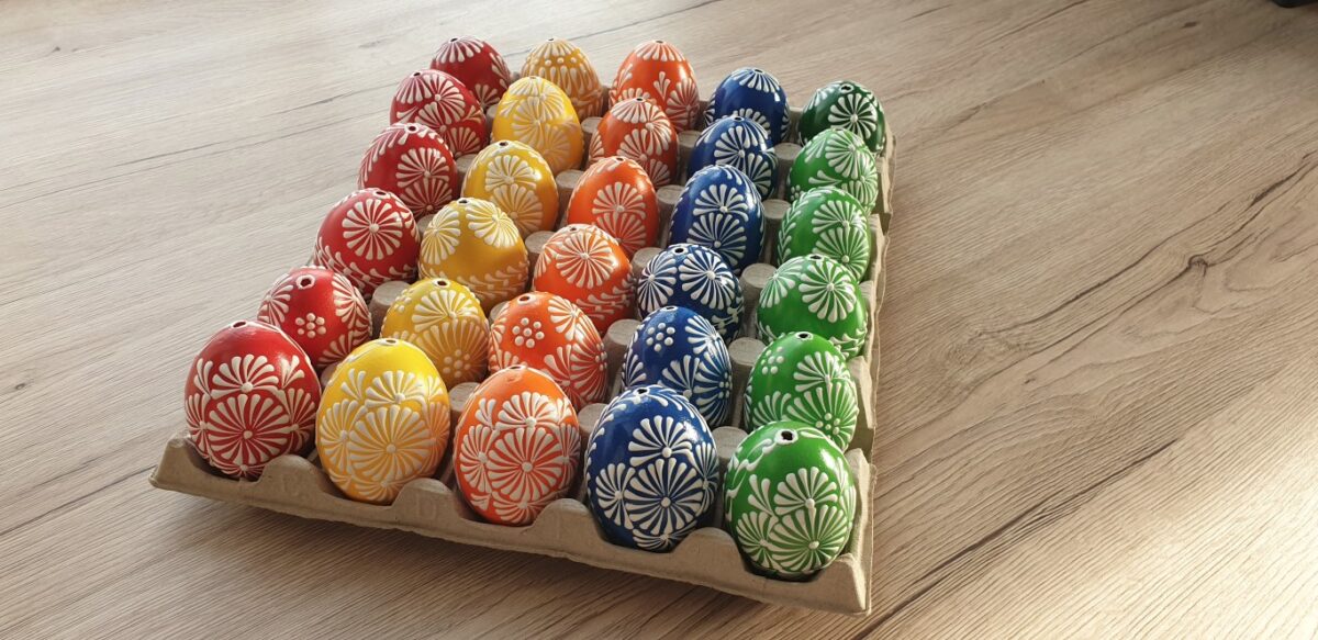 Natürlich können diese schönen Basteleien auch im fertigen Zustand erworben werden. In der Stube im Denkenbauernhof zeigt Zora Felixovà ein buntes Sortiment von Ostereiern, verziert mit Wachstechnik. Diese werden auch zum Verkauf angeboten.