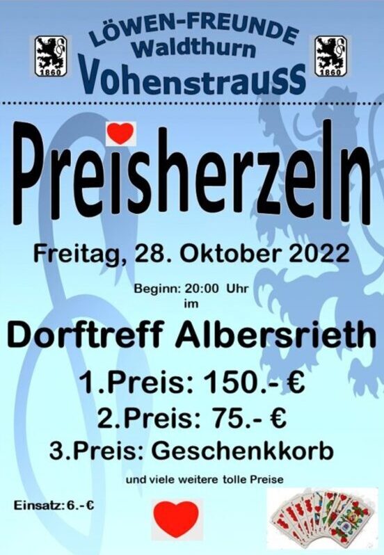 Zum traditionellen Preisherzeln laden die Löwenfreunde Waldthurn-Vohenstrauß die Kartenfreunde am kommenden Freitag (28. Oktober 2022, Beginn 20 Uhr) in den Dorftreff Albersrieth ein. Wer nach zwei Kartenrunden mit jeweils 30 Spielen die wenigsten Herzkarten hat, kann mit 150 Euro mehr in der Tasche den Heimweg antreten.