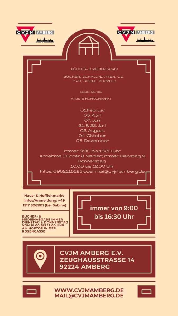 Wer gerne selbst auf Floh- bzw. Trödelmärkte geht, kann sich unter der Nummer 01517 3061011 an die Verantwortliche wenden, sie ist für die Organisation des Hausflohmarktes verantwortlich. Wer den CVJM Amberg e.V. mit Büchern und anderen Medien unterstützen möchte, kann diese gerne nach Absprache unter 09621 15525 (bitte auf Band sprechen) immer Dienstag & Donnerstag zwischen 10 & 12 Uhr am Hoftor in der Rosengasse abgeben. Flyer mit den aktuellen Terminen sind vor Ort erhältlich.