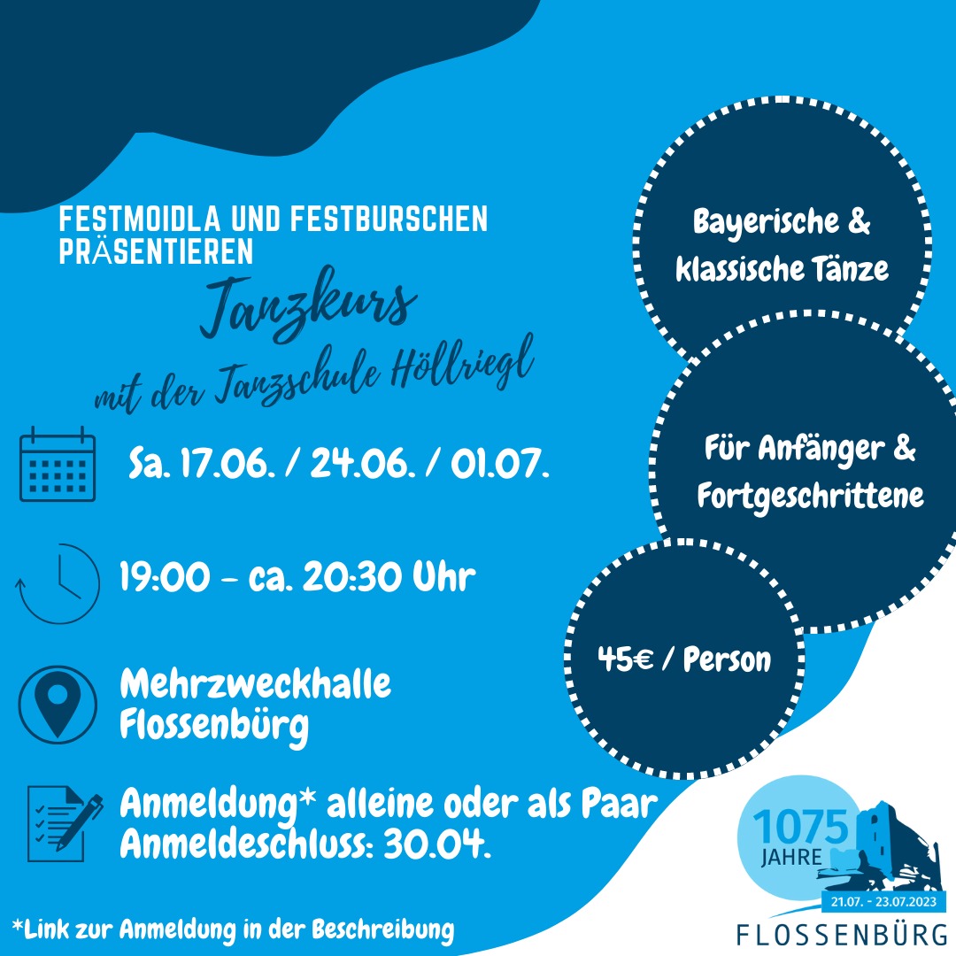 Die weiteren Termine dieses Tanzkurses sind am 24. Juni 2023 und am 1. Juli 2023 in der Flossenbürger Turnhalle. Der Preis für diesen Tanzkurs beträgt pro Person 45 Euro. Der Anmeldeschluss ist der 30. April 2023.