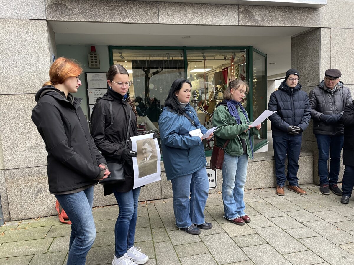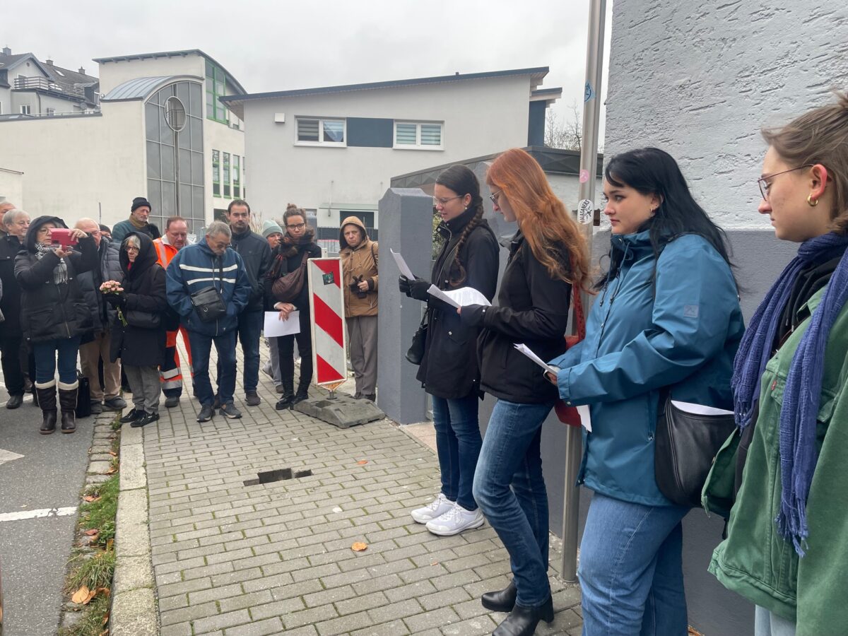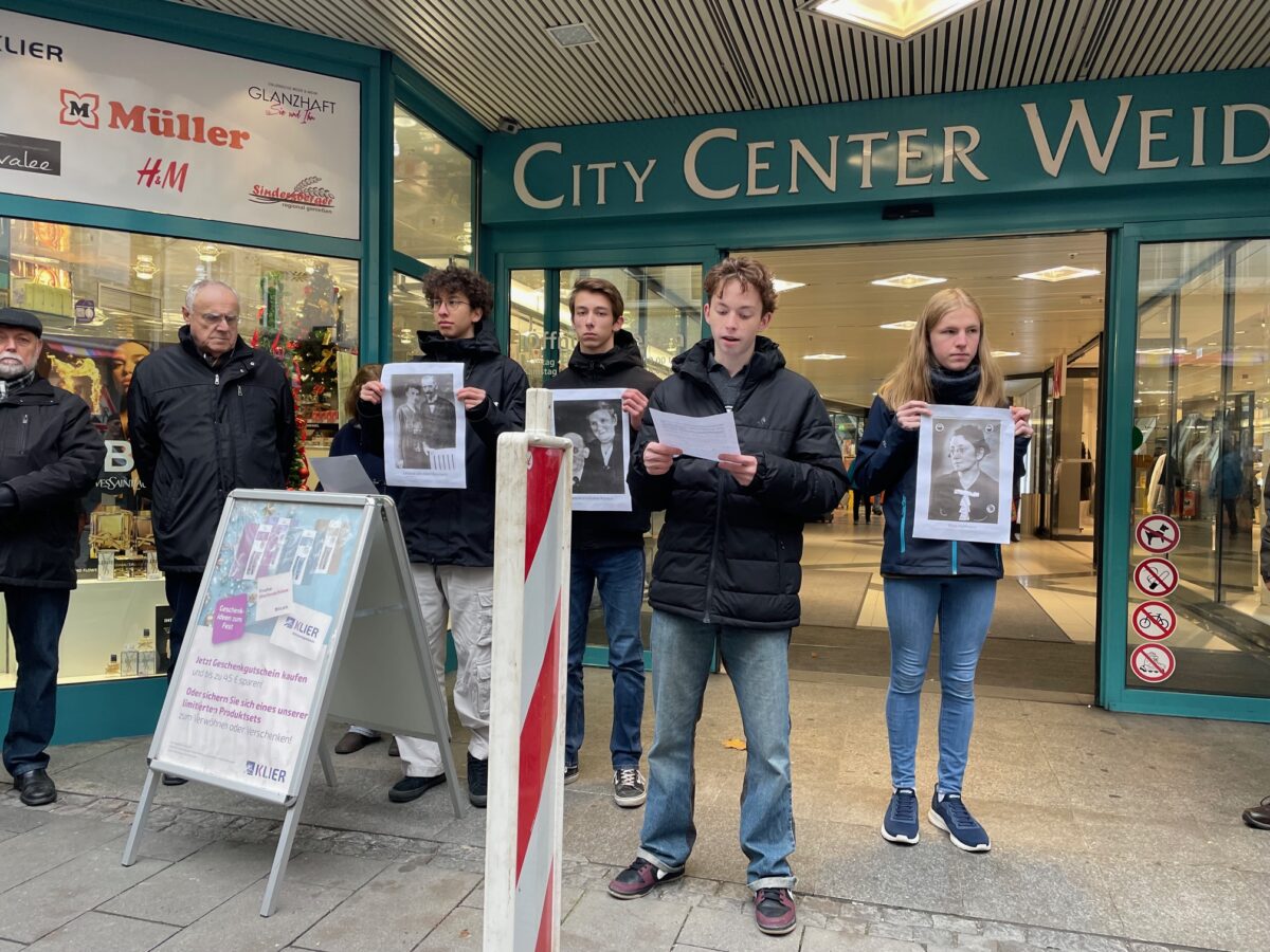 Elftklässler des Kepler-Gymnasiums Weiden, begleitet von Lehrer Tobias Wagner und Direktor Alexander Wildgans, erinnern an die Schicksale der Familien Boscowitz-Rebitzer und Kohner. “Vor vier Monaten standen wir vor den Toren Auschwitzs”, sagt Schüler Cristiano Goncalves an eine Klassenfahrt. Die Dimension des Leids und der Verbrechen sei ihnen dabei bewusst geworden. Die Schüler verlegen am Dienstag die Stolpersteine für die Weidener Opfer selbst: “Wir sind dankbar, diese Ehre zu erhalten.”