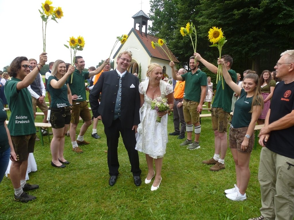 „Wir wünschen euch viele kleine Fußballer, denn wir brauchen Nachwuchs“, sagte 2. Vorsitzender Udo Schönberger zum Chef der DJK Seugast und seiner Tanja. Mit Sonnenblumen, die sie dann dem strahlenden Paar als zu ihm passenden Strauß überreichten, gratulierten die Seichatsa Kirwaleit.