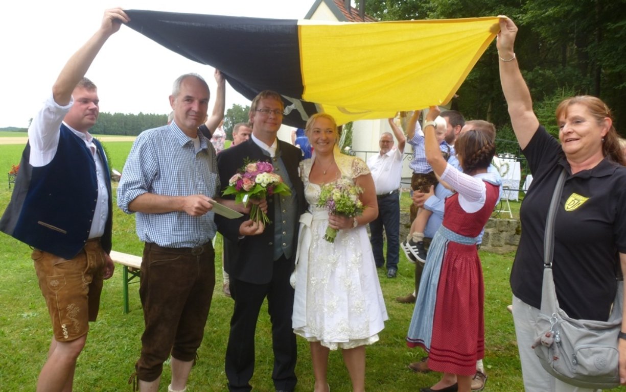 Mit großem Transparent war der Jägermeisterclub Freihung aufmarschiert, um dann natürlich auf eine glückliche Zukunft von Tom und Tanja gemeinsam anzustoßen. Darüber hinaus überbrachten der Knobelclub und Dartclub Freihung sowie viele Freunde ihre Glückwünsche. Auch dritter Bürgermeister Johannes Ott sowie die Markträte Stefan Blind und Oskar Götz erwiesen ihrem Marktratskollegen die Ehre. Nach der langen Gratulationscour und einem Sektumtrunk bei leichten Regentropfen zog das Brautpaar mit seinen 90 Gästen hinunter ins Seugaster Schützenheim, wo die Band „Sommerwind“ für eine ausgiebige und zünftige Fete sorgte.