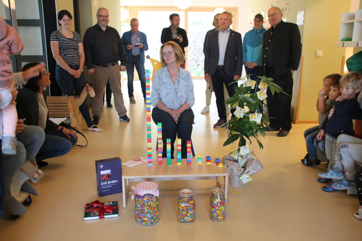Mit 8510 Smarties verdeutlichte die Leiterin des Kindergartens die Anzahl der Arbeitstage von Marga Frey-Käsbauer. Bei nur 27 Krankheitstagen in dieser Zeit betreute sie in 58 Gruppen 445 Kinder. Dreißig Kolleginnen arbeitete mit ihr zusammen und Schwester Paula und Irmgard Nößner waren zwei weitere Chefinnen.