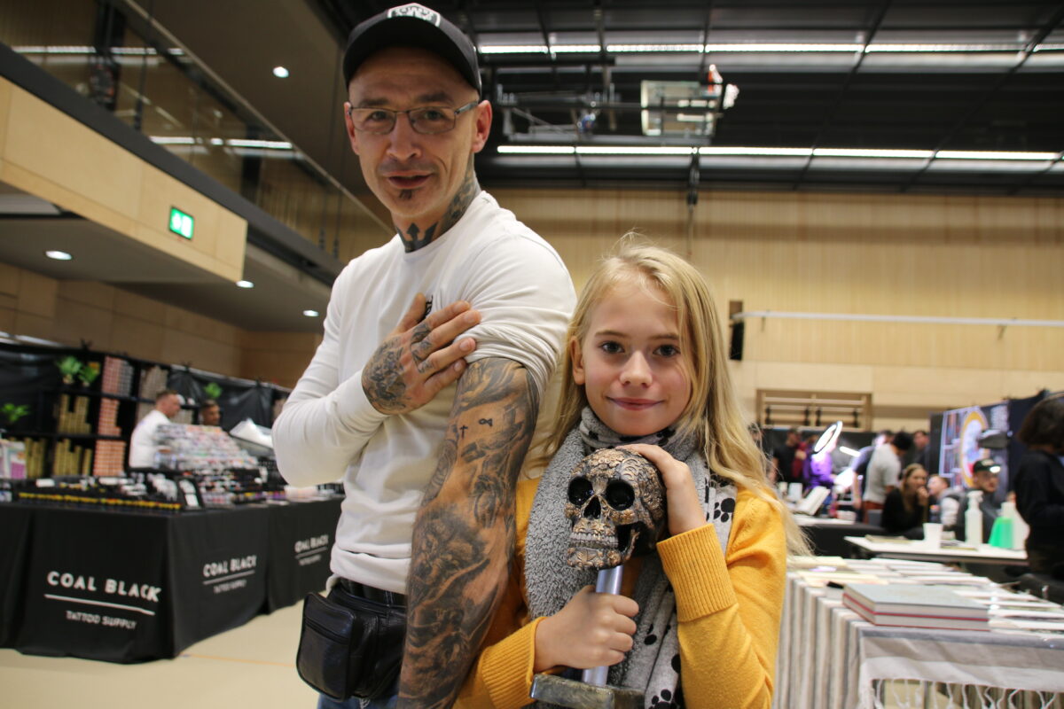 Die Tattoo-Szene ist keine stocksteife Branche – es wird viel gelacht, gemeinsam mal ein Bier getrunken und seine Späße getrieben. Fikret Topic, der Inhaber des Studios „Gerade Linie“ in Schweinfurt, war mit seiner Familie nach Grafenwöhr gereist. Am Samstagabend wollte seine Tochter Zoe (9) sich auch mal am Tätowieren versuchen. Topic ganz locker: