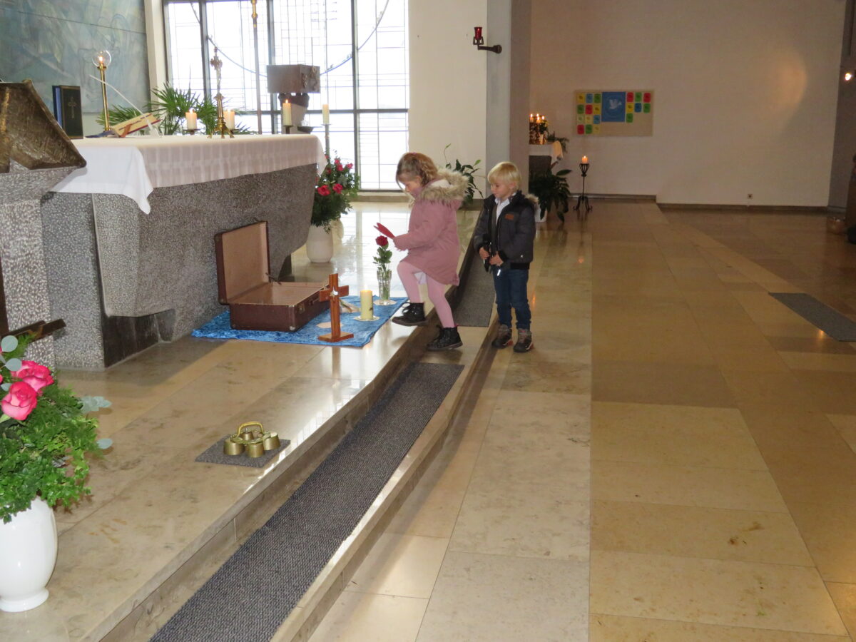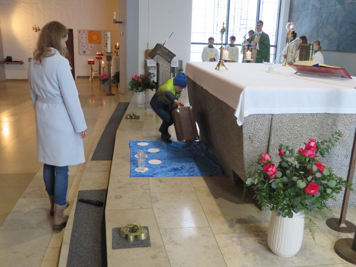 Gemeinsam mit Pfarrer Thomas Kopp und den Ministranten zogen die Kinder in die Kirche ein. Hier feierten die mit ihren Eltern, Geschwistern und der Pfarrgemeinde die Gründung des Kindergartens. Mit einem Spiel der Kinder unter dem Motto „Ein Koffer voller Erlebnisse – Unsere Reise durch die Kindergartenzeit“ begann der Erinnerungsgottesdienst. Dabei brachten die einen Koffer, ein Kreuz, Kerzen, Blumen und ein Herz zum Altar. Mit dem Spiel verdeutlichten die Kinder ihre Zeit und das Erleben im Kindergarten. Gemeinsam mit den Eltern beteten die Kinder die Fürbitten.