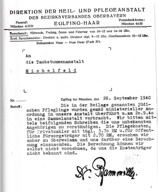 All das rettet Emma Wilmersdörfer nicht. Am 14. September 1940 werden die vier jüdischen Patientinnen in die Heil- und Pflegeanstalt Eglfing-Haar bei München verlegt. Von dort werden die Frauen am 20. September in “eine Sammelanstalt verbracht”, teilt die Anstalt Eglfing-Haar dem Kloster Michelfeld mit. Ein Ort wird nicht genannt.