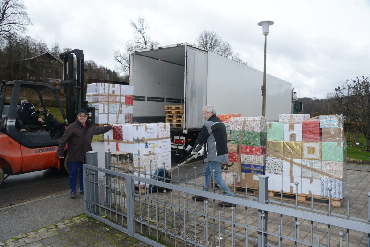 Mit Unterstützung von Christian Fuchs von der gleichnamigen Spedition in Waidhaus beluden Bruno Friedl und “Luggi” Wüst den Sattelschlepper, dessen Fahren am zweiten Weihnachtsfeiertag als erste Ziel Passau zu erreichen hatte. Von dort aus fuhren alle “Johanniter-Weihnachtstrucker” im Konvoi Richtung Rumänien.