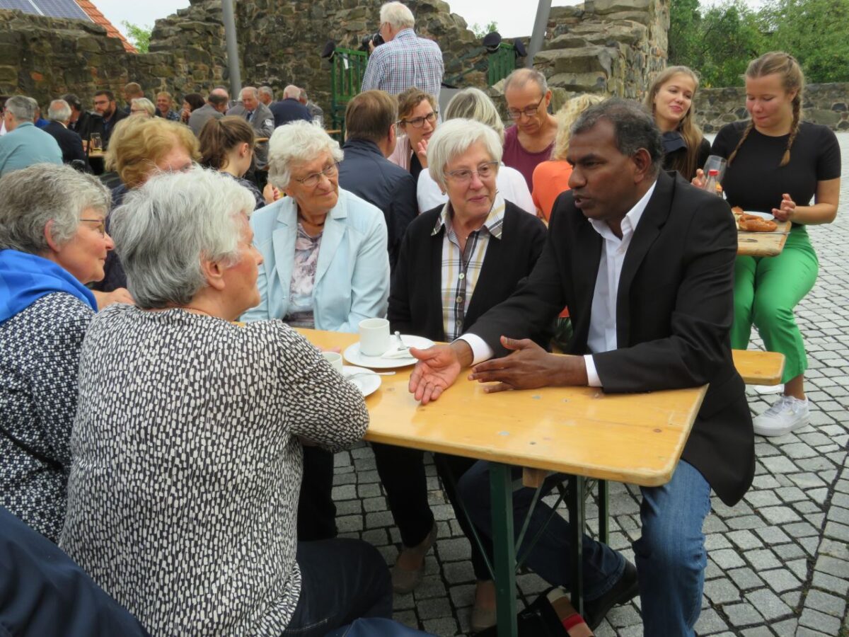 Nach dem Gottesdienst ging es gemeinsam in den Rosengarten am Vulkanerlebnis. Beim gemeinsamen Weißwurst-Frühstück suchte Pfarrer Pennoraj Tharmakkan nochmal in