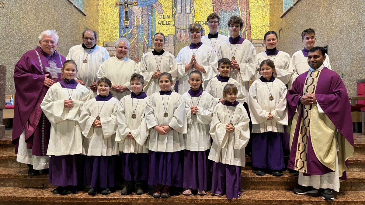 Konzelebrant war Pfarrvikar Jomet Joy. Oberministrantin Anna Pausch hieß die “Neuen” willkommen und hängte ihnen feierlich ihre Ministranten-Plaketten um. Nach der Heiligen Messe bekamen alle ihren Ministranten-Ausweis und jeweils eine Urkunde. Vom Geistlichen und den Kirchenbesuchern willkommen geheißen wurden Anastasia, Julia, Max, Elvira, Lourdessa, Nikol, Henry und Charlotte.
