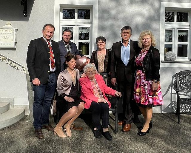 Wenn auch die Beine nicht mehr so wollen, so ist sie geistig frisch und das Alter sieht man ihr nicht an. Zu Ihrem Ehrentag kam auch Bürgermeister Anton Kappl und vom Oberpfälzer Waldverein Leuchtenberg der Vorsitzende Michl Schwabl um zu gratulieren. Im Kreise ihrer Familie ließen Sohn Hans und Tochter Klara ihre Mama und die Enkel Yasmin und Markus sowie die beiden Urkenkel Marlene und Anika ihre Oma und Uroma im Gasthof Heuberger in Atzenhof hochleben.