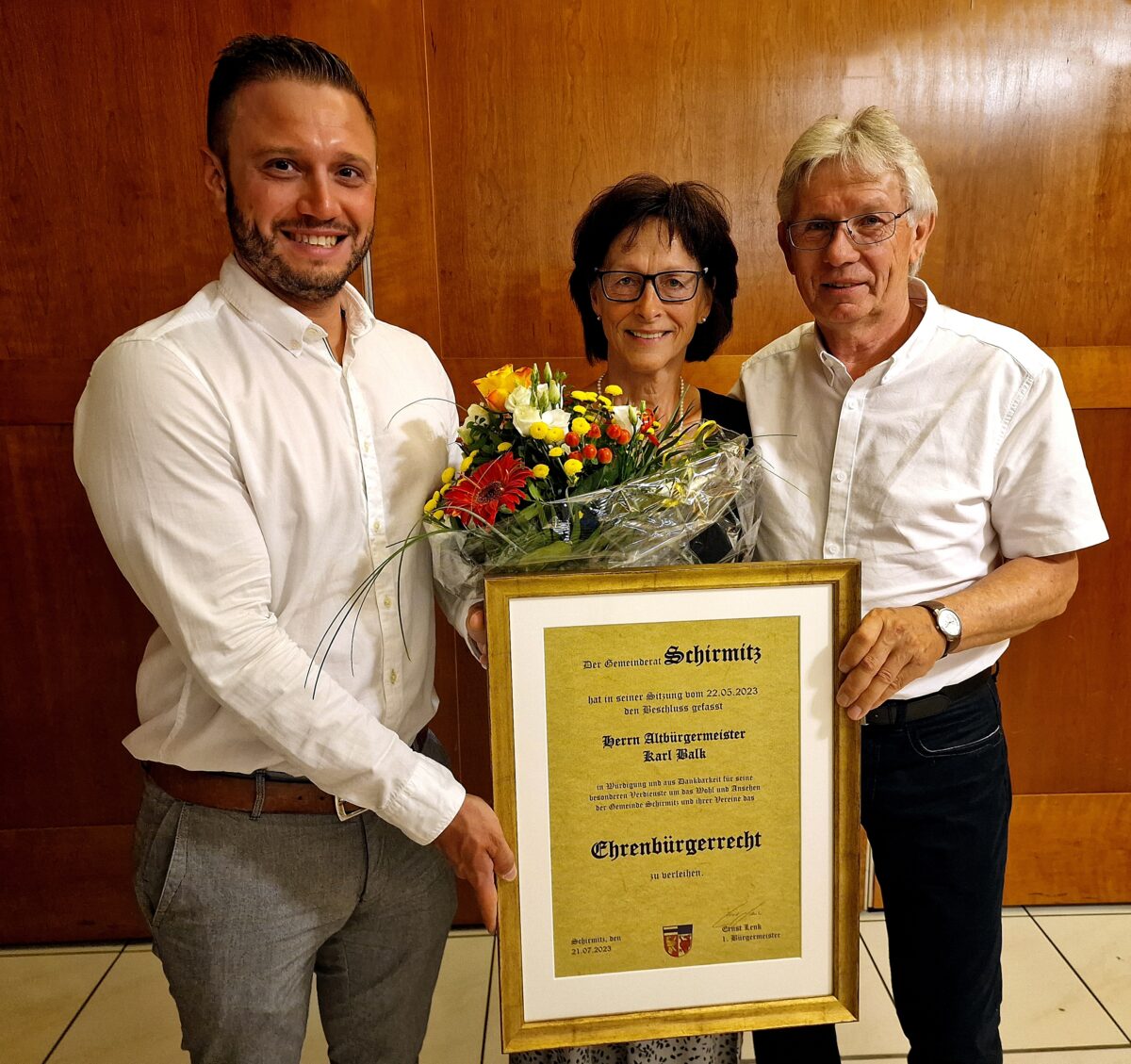 In Anerkennung seiner großen Verdienste ernannte Lenk den Jubilar in Abstimmung mit dem Gemeinderat zum Ehrenbürger der Gemeinde Schirmitz. Er überreichte die Ehrenurkunde, für die Ehefrau gab es Blumen.