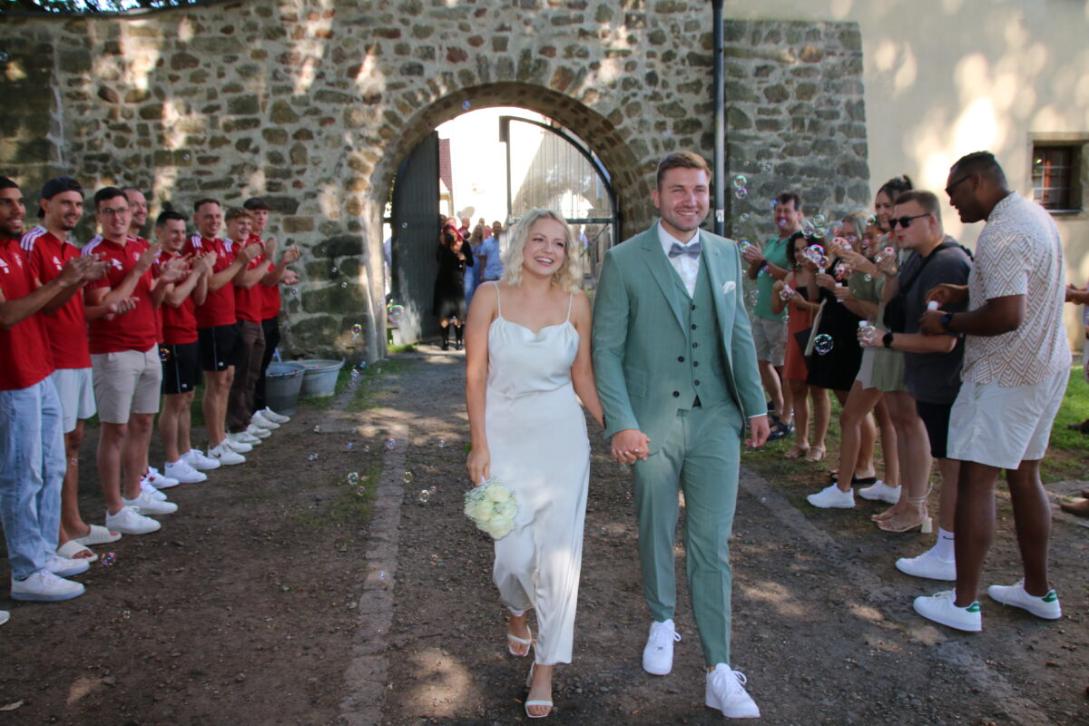 Nach der standesamtlichen Trauung durch Holger Cibis standen dann auch Valentins Mannschaftskameraden von der Fußballmannschaft der SV Grafenwöhr und Michelles Kollegen von der Grundschule in Weiherhammer Spalier. Das Kollegium hatte ihnen ein Anagramm aus wild durcheinandergewirbelten Buchstaben vorgesetzt. Aus diesem formten Michelle und Valentin schließlich „Gemeinsam durchs Leben“.