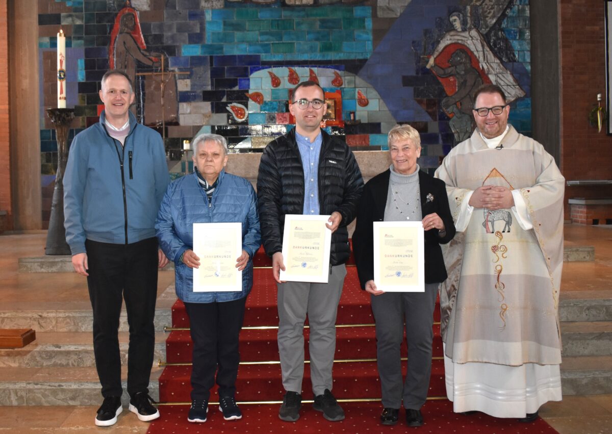 Im Namen der Pfarrgemeinde bedankte sich während des Gottesdienstes Pfarrer Daniel Fenk auch bei den ausscheidenden Pfarrgemeinderäten Pascal Hofmann (4 Jahre), Karl Schultes (8 Jahre), Christa Klug (12 Jahre) und Maria Zitzmann (16 Jahre). „Ich danke euch von Herzen, dass ihr Zeit, Kraft und Begabungen eingebracht habt. Vergelt’s Gott für alles, was ihr für uns und für andere getan habt – für das, was sichtbar geworden, und auch für das, was im Verborgenen gewachsen ist.“