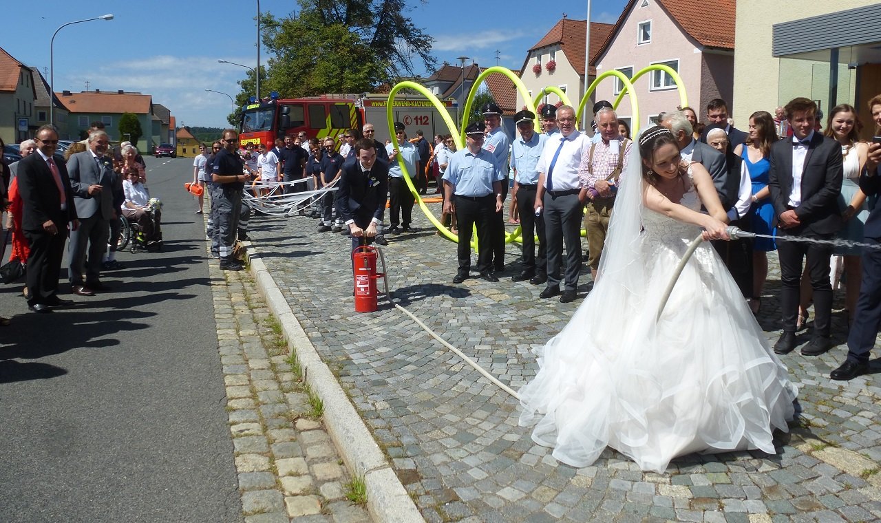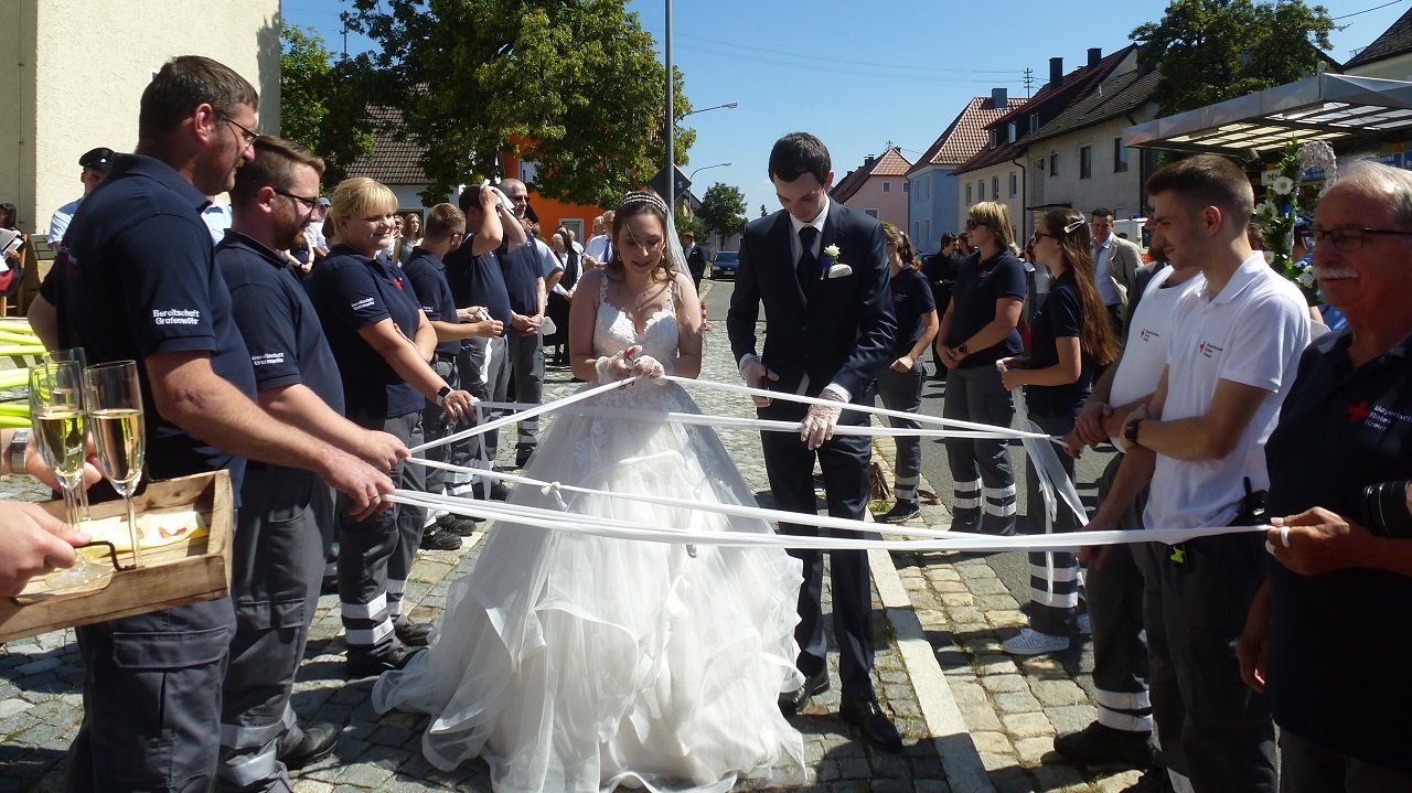 Beim Durchschreiten der Schlauchspirale stießen Vorsitzender Thomas Gmeiner und Kommandant Alexander Kummer mit Sekt auf eine gute Zukunft des Aktiven Feuerwehrmannes und seiner Angetrauten an. Bei der kleinen Übung bewiesen beide, dass sie eventuelle „Ehebrände“ gemeinsam löschen. Dann galt es den Weg durch weiße Bänder freizuschneiden, ehe BRK-Bereitschaftsleiter Hermann Regler sowie Markus Dreyer und Markus Kummer für die HvO mit Blumen und Sekt gratulierten.